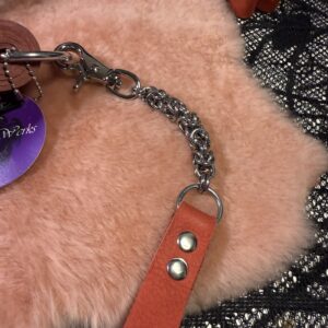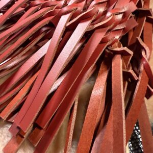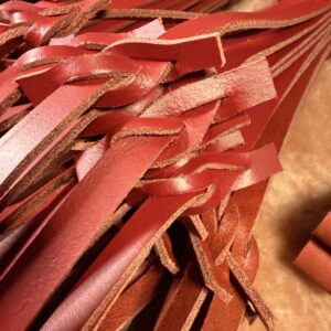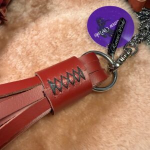 These Cardinal B*stard Poi floggers are made from stiff red heavy leather. A creation from our standard B*stard floggers. They feature 30, 1cm wide falls measuring 34cm from the bottom of the band with interlinked sections. Complete with our upgraded stainless steel 2mm thick chain mail to secure the finger loops.
