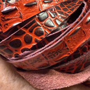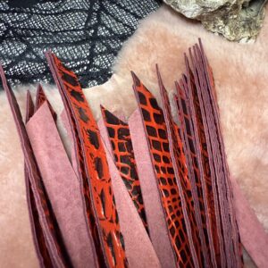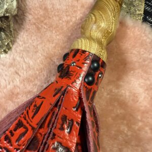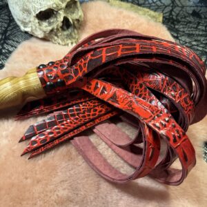 Gatorblood, a flogger made from blood red and black cowhide embossed with an alligator print. This flogger features 40 2cm wide falls that are 46cm long with angled tips. This flogger will give you a thuddy sensation with a delicious nip from the angled tips. All seated in a reclaimed hardwood handle with burl detailing.