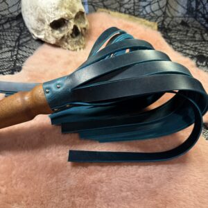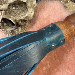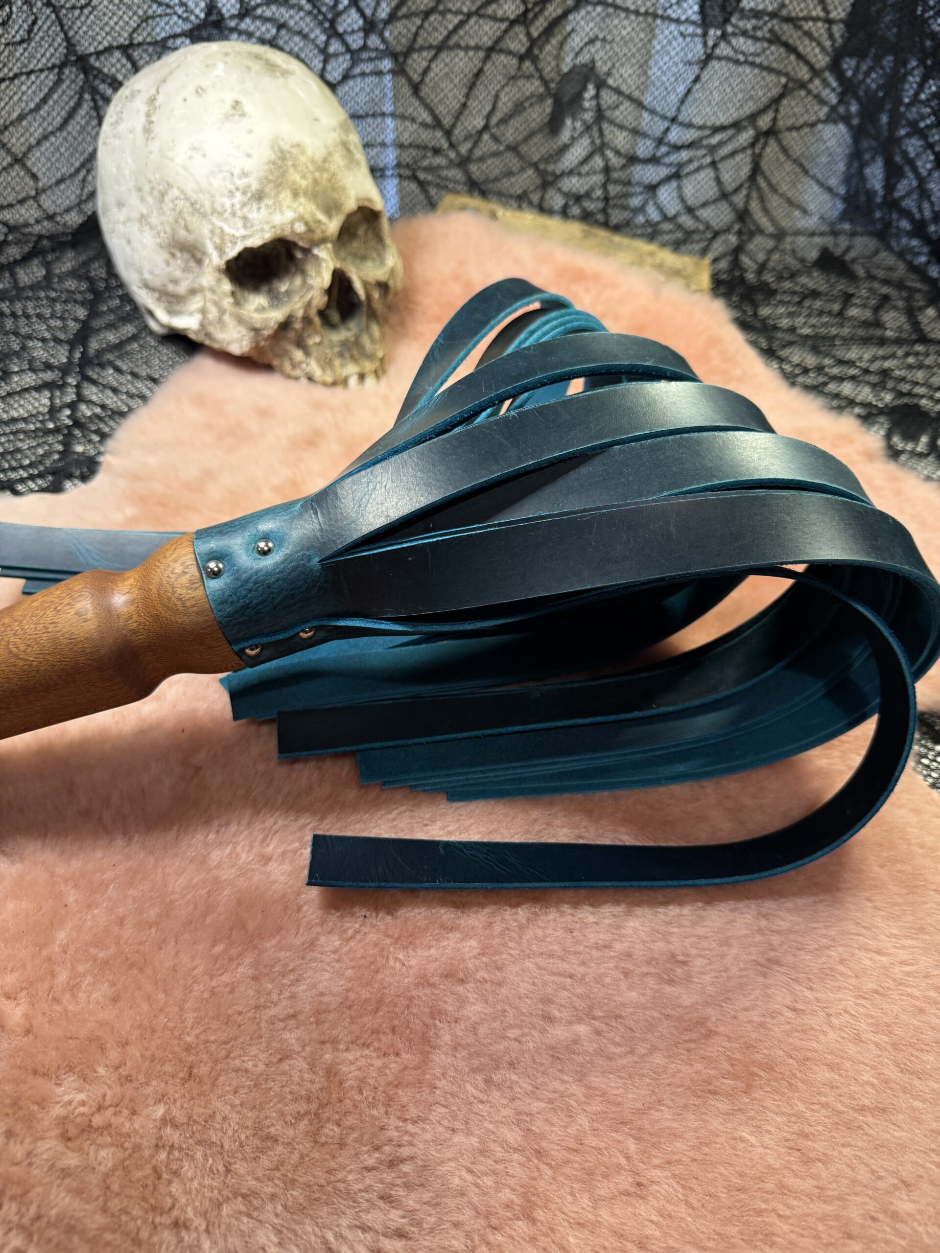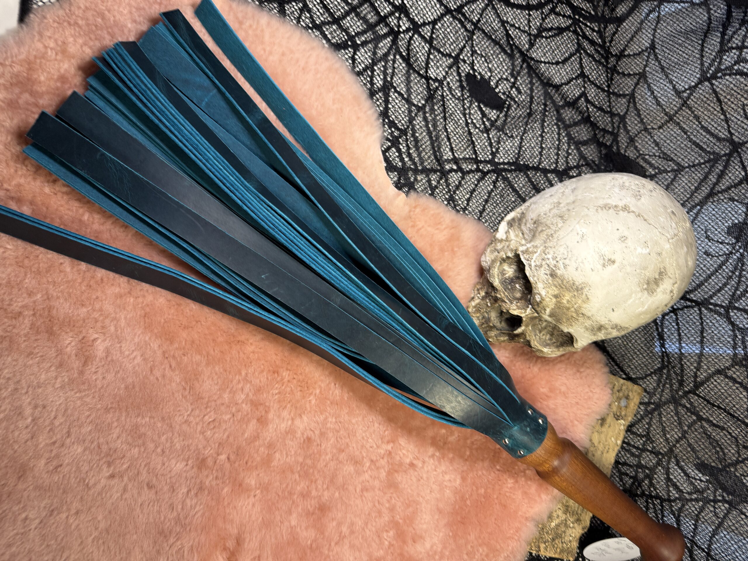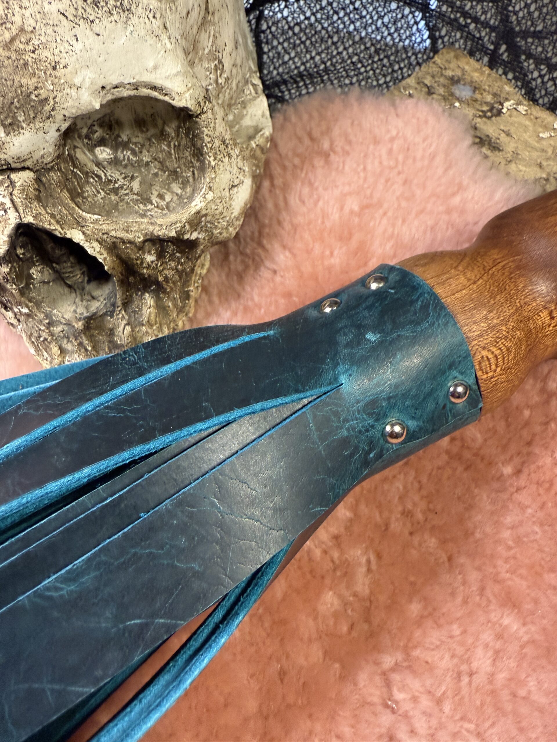 Greenstone, a flogger made from Teal Green heavy pull-up leather. This flogger features 28 2cm wide falls that are 40cm long . This flogger will give you a deep thuddy sensation. All seated in a reclaimed hardwood handle .