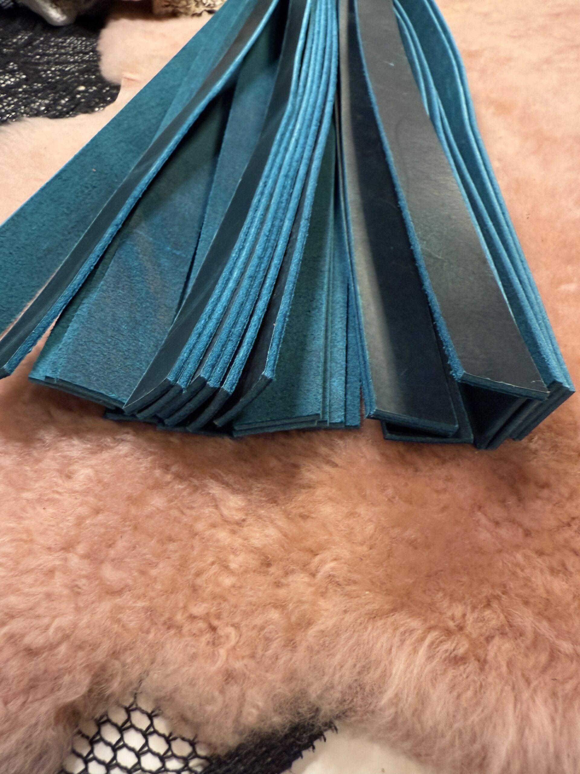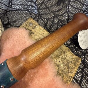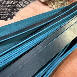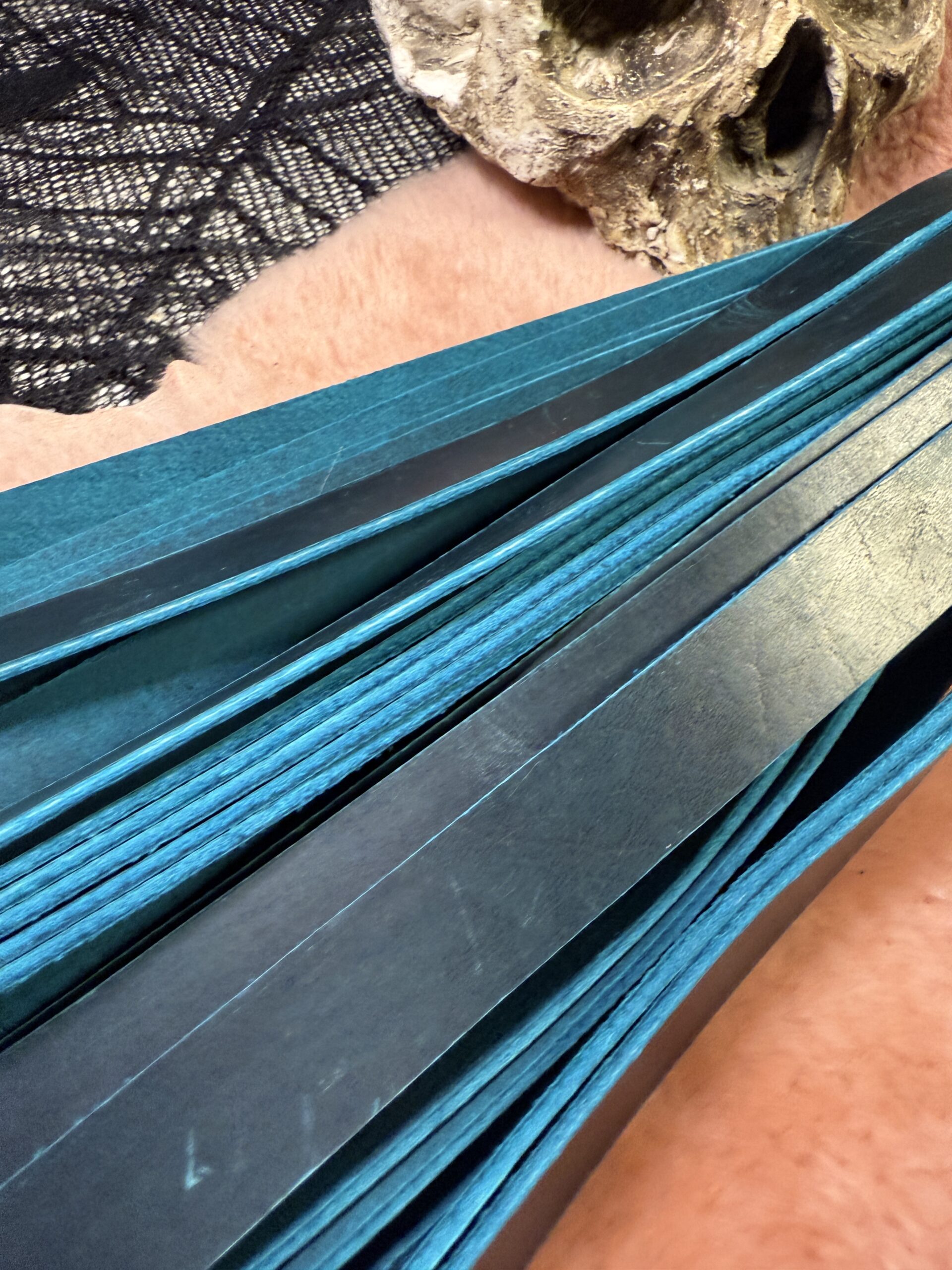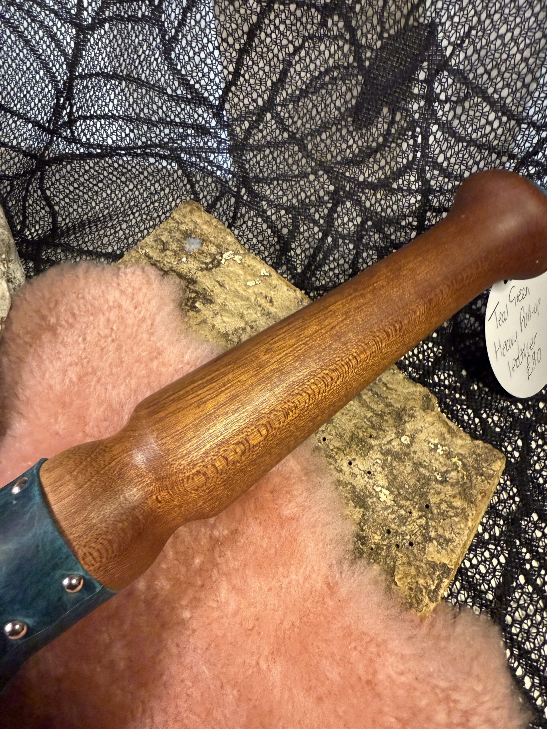 Greenstone, a flogger made from Teal Green heavy pull-up leather. This flogger features 28 2cm wide falls that are 40cm long . This flogger will give you a deep thuddy sensation. All seated in a reclaimed hardwood handle .