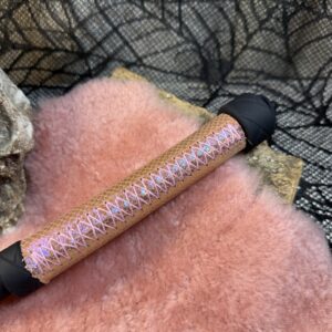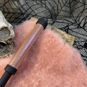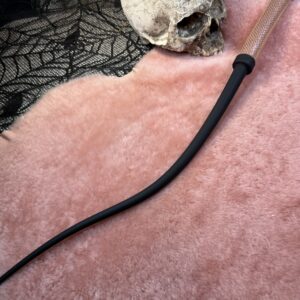 This rubber whip features a Holographic leather wrapped handle. It has an overall length of 60cm. Rubber whips can be delightfully evil with a little practice.