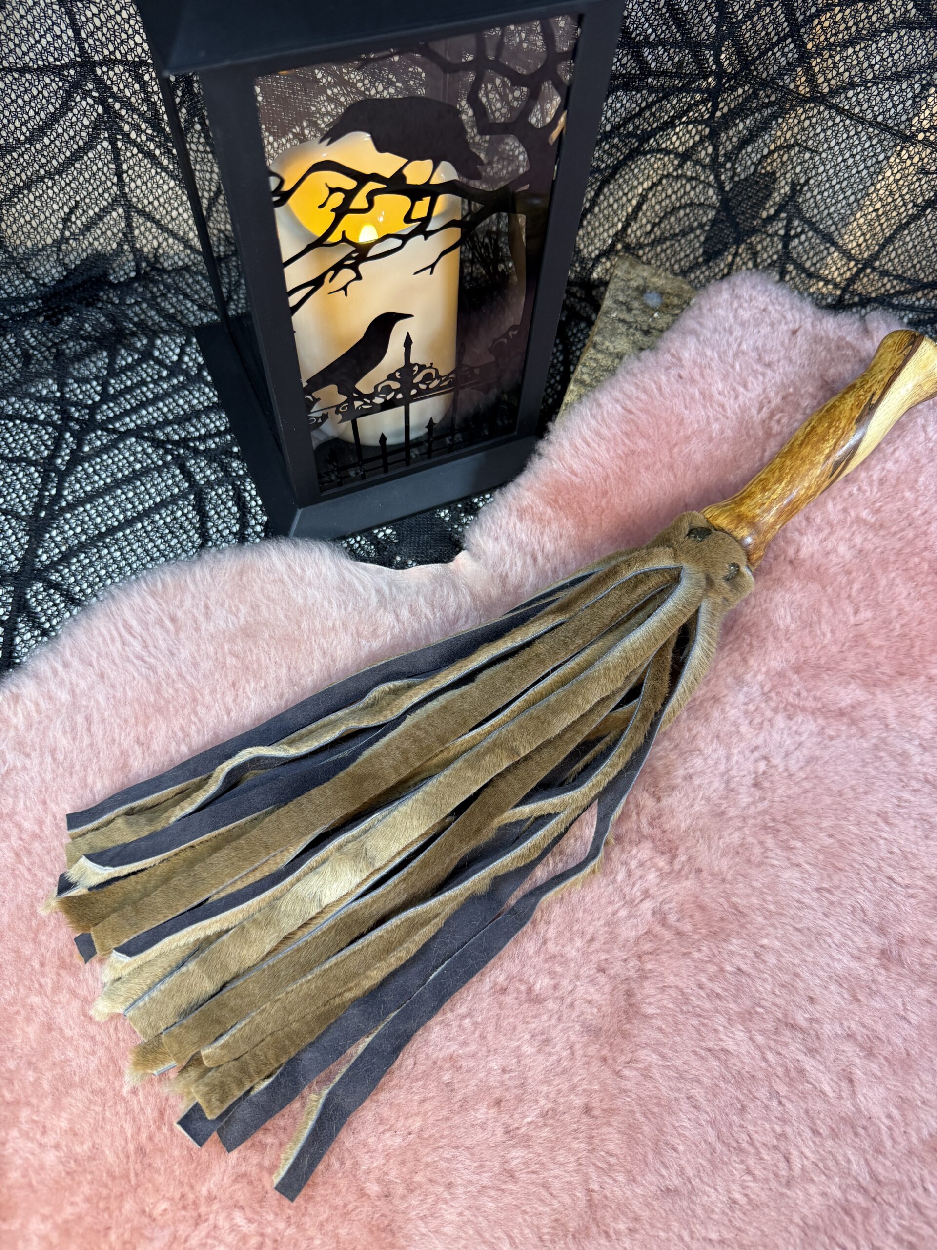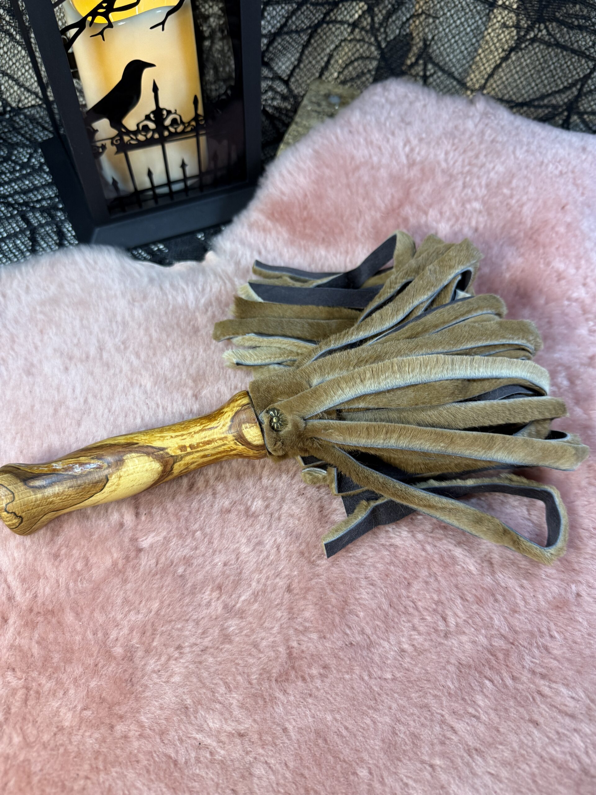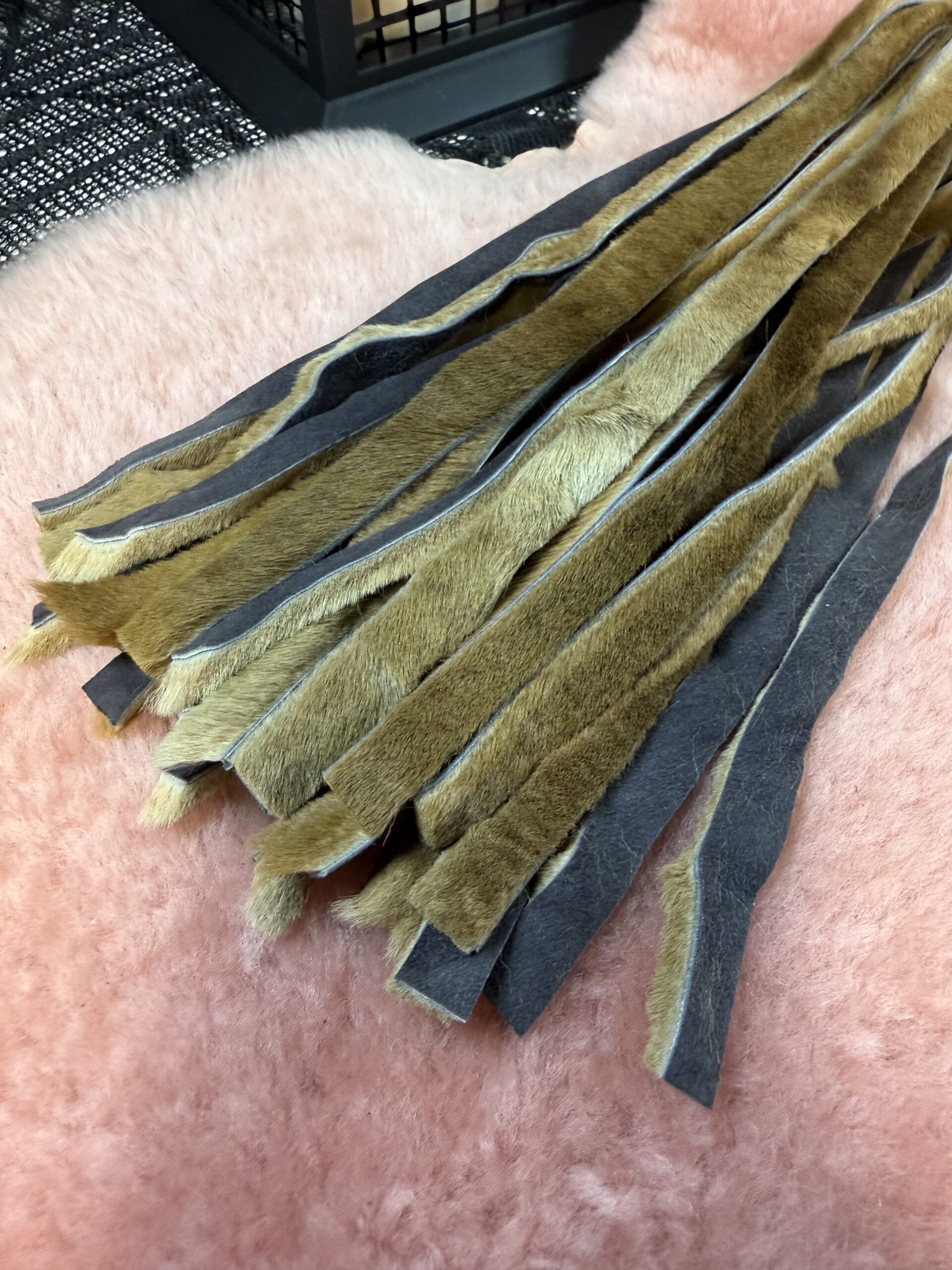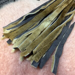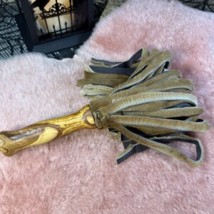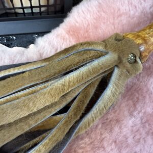 Joey the baby Roo flogger is made from soft kangaroo hide. This flogger has 30 1cm falls that are 26cm long. This is a light-weight flogger that can be sensory or a little thuddy depending on how you use it. Its a lovely small and compact flogger and a great addition to any playkit.