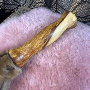 This flogger is finished with a hand-turned reclaimed handle. The handle grip measures 11cm overall.