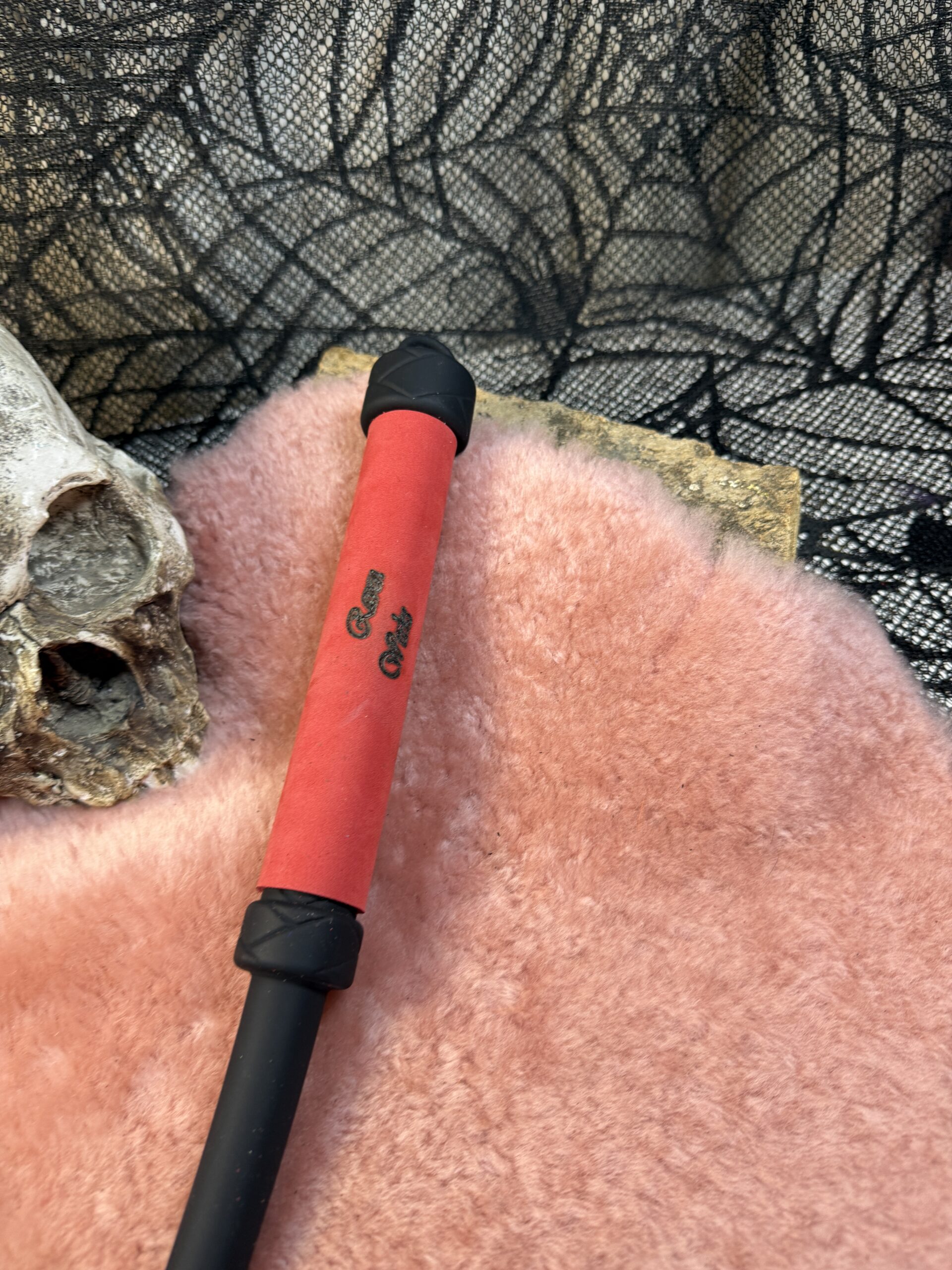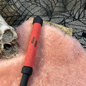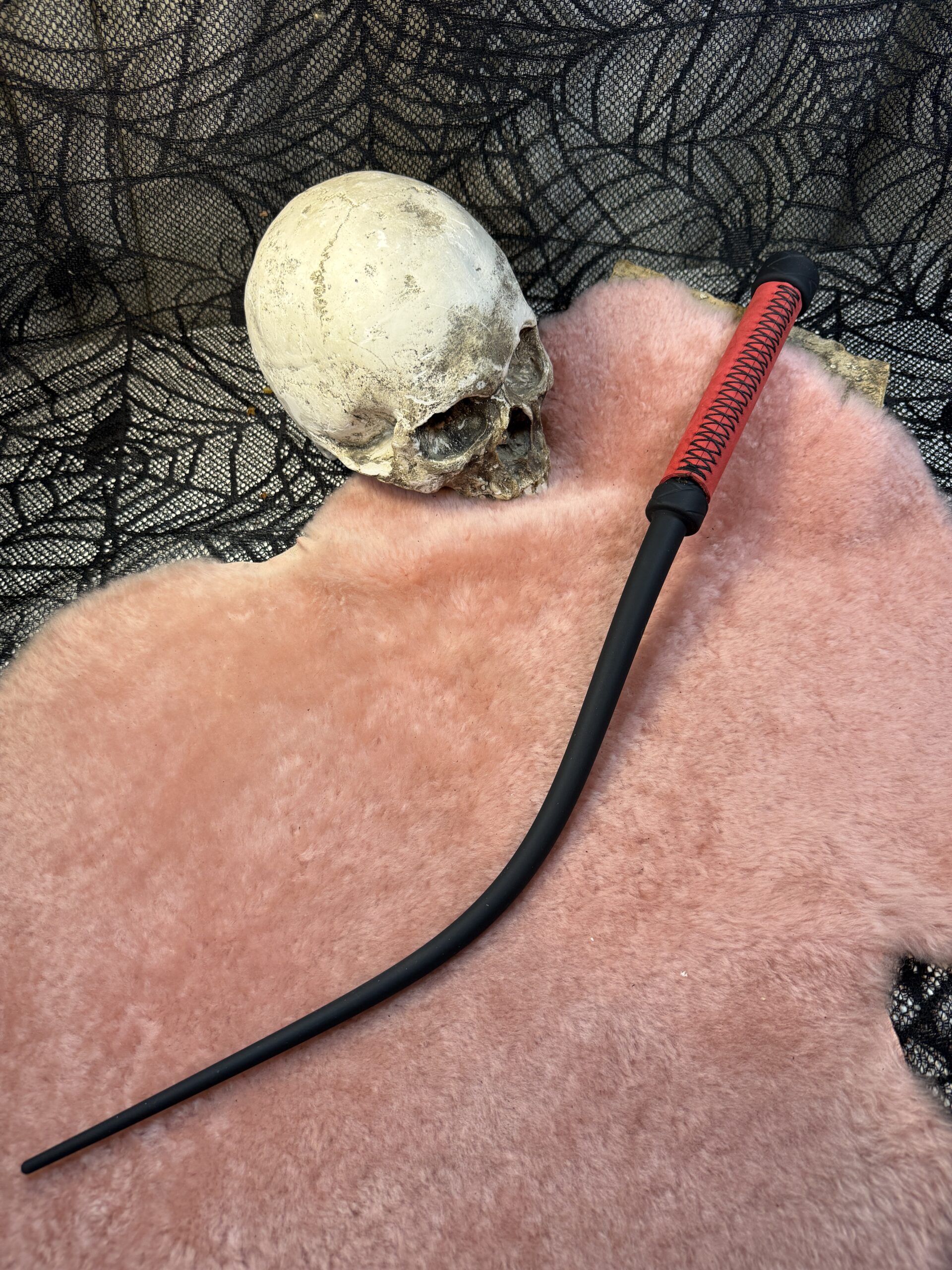 This rubber whip features a Red leather wrapped handle. It has an overall length of 60cm. Rubber whips can be delightfully evil with a little practice.