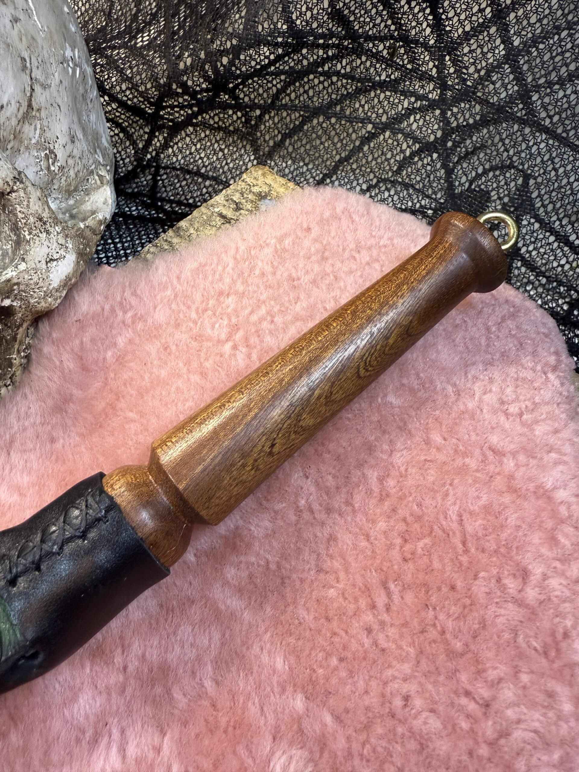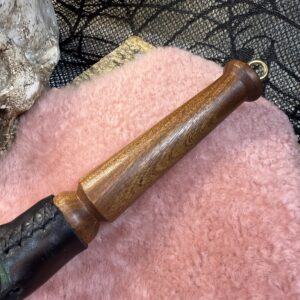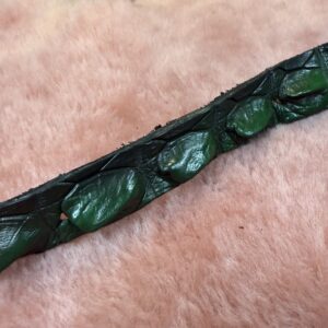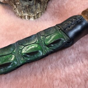 This short green coloured Alligator Back Strap Dragon Tail is made from ethically and sustainably source Alligator. This has a reclaimed wood handle. This is an intense sensation and has a lot of after bite depending on how you land it.The backstrap scales are very interesting for sensation and sting. Each tail will vary slightly as will the handle.