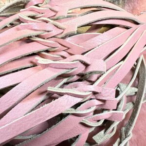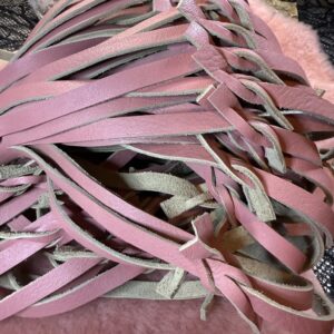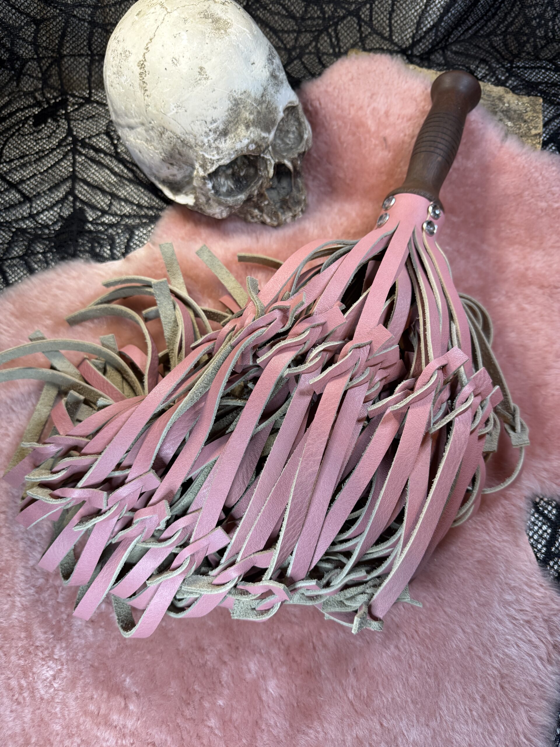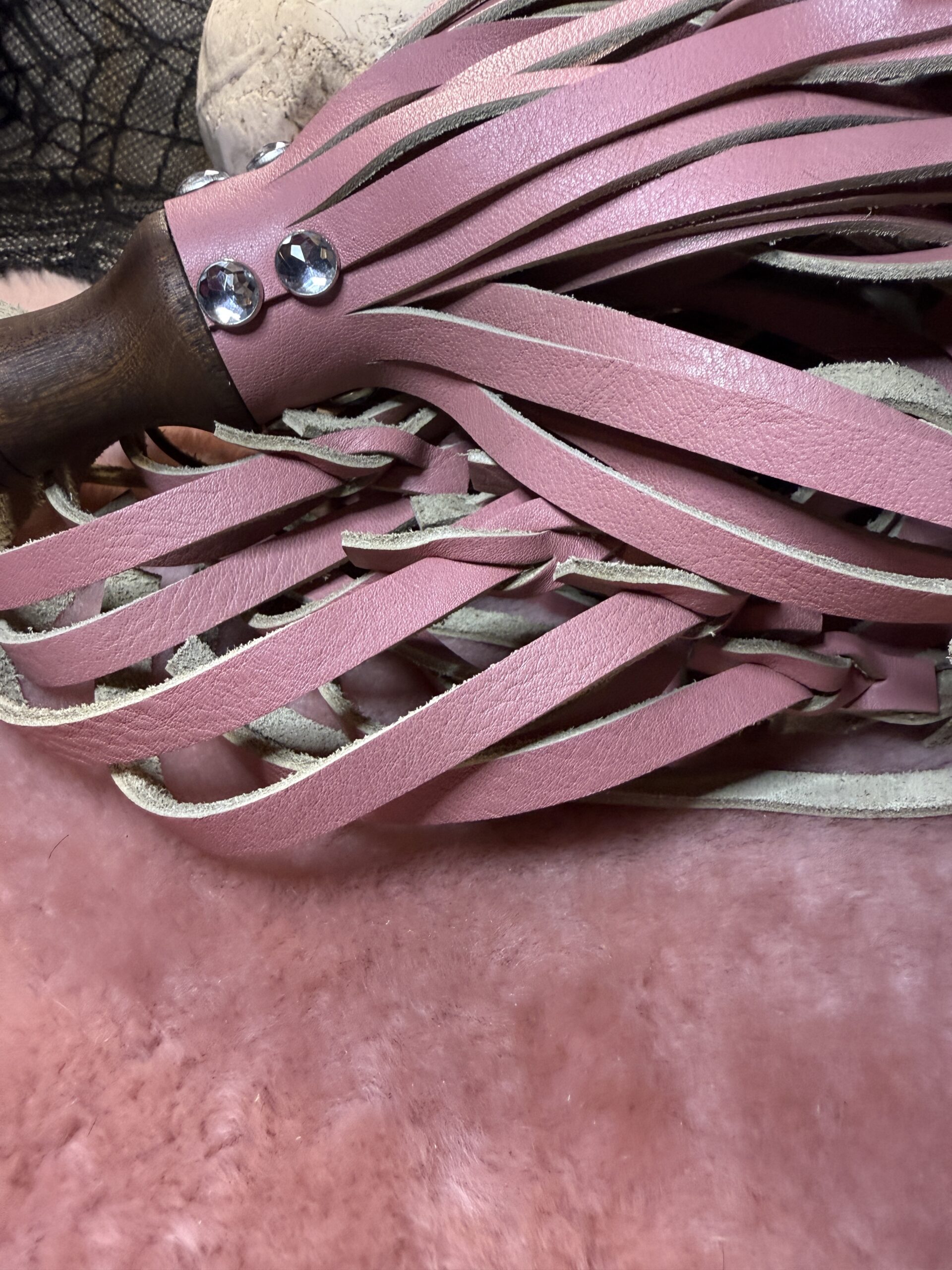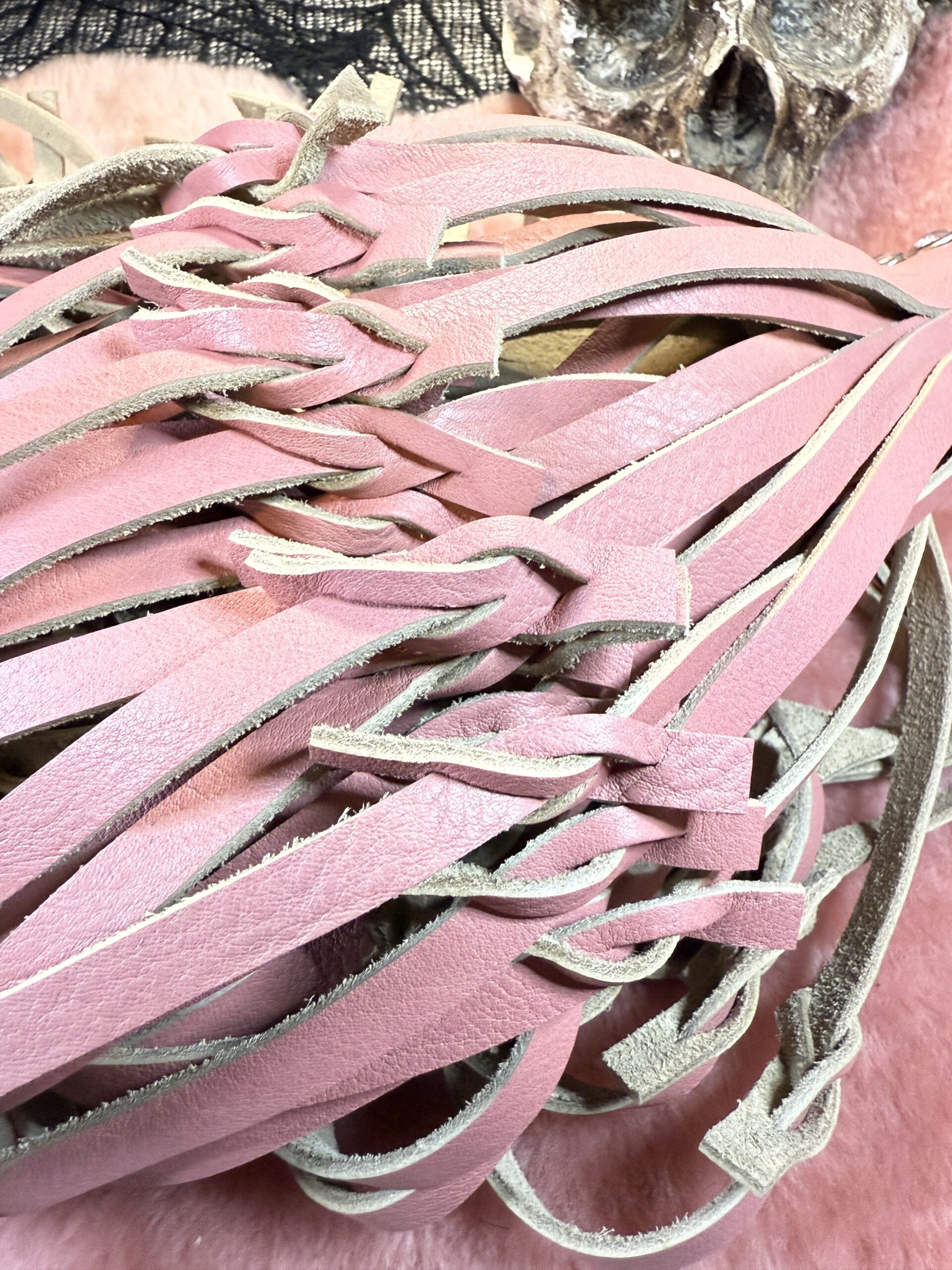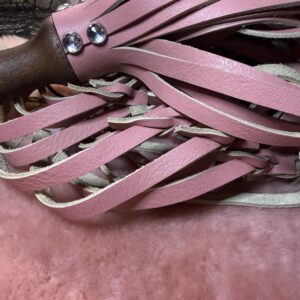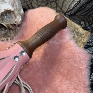 This B*stard Princess flogger is made from a baby pink thick supple leather. It features 64 narrow falls that are 47cm long, with interlinked sections This will give a slightly softer stingy, and thuddy sensation. The flogger is seated in a recycled wood handle with sparkle studs.