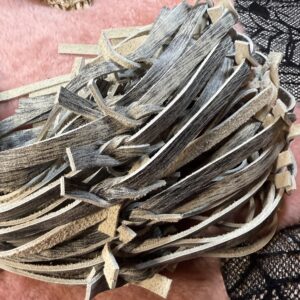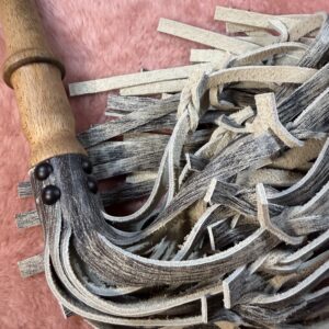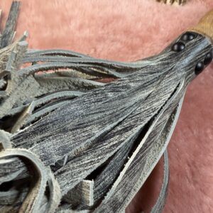 This B*stard Silver Fox flogger is made from soft silver grey thick leather. It features 40 narrow falls that are 44cm long, with interlinked sections This will give a soft stingy, and thuddy sensation. The flogger is seated in a recycled wood handle.
