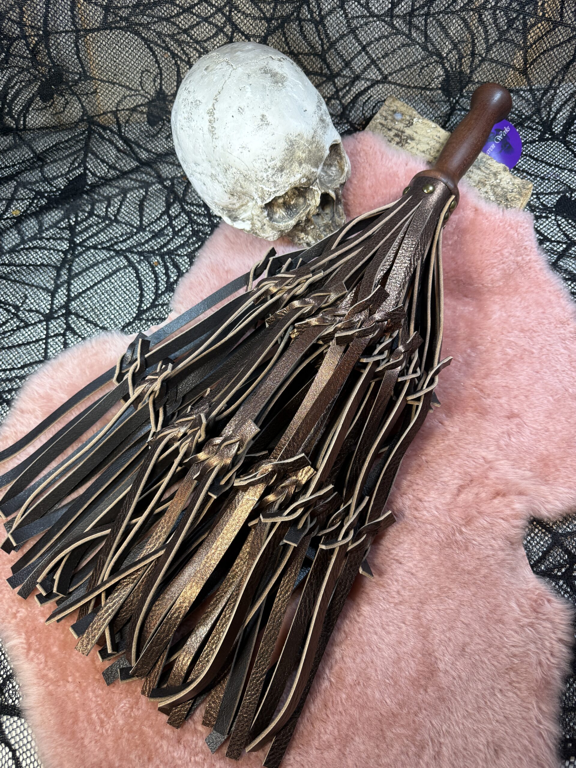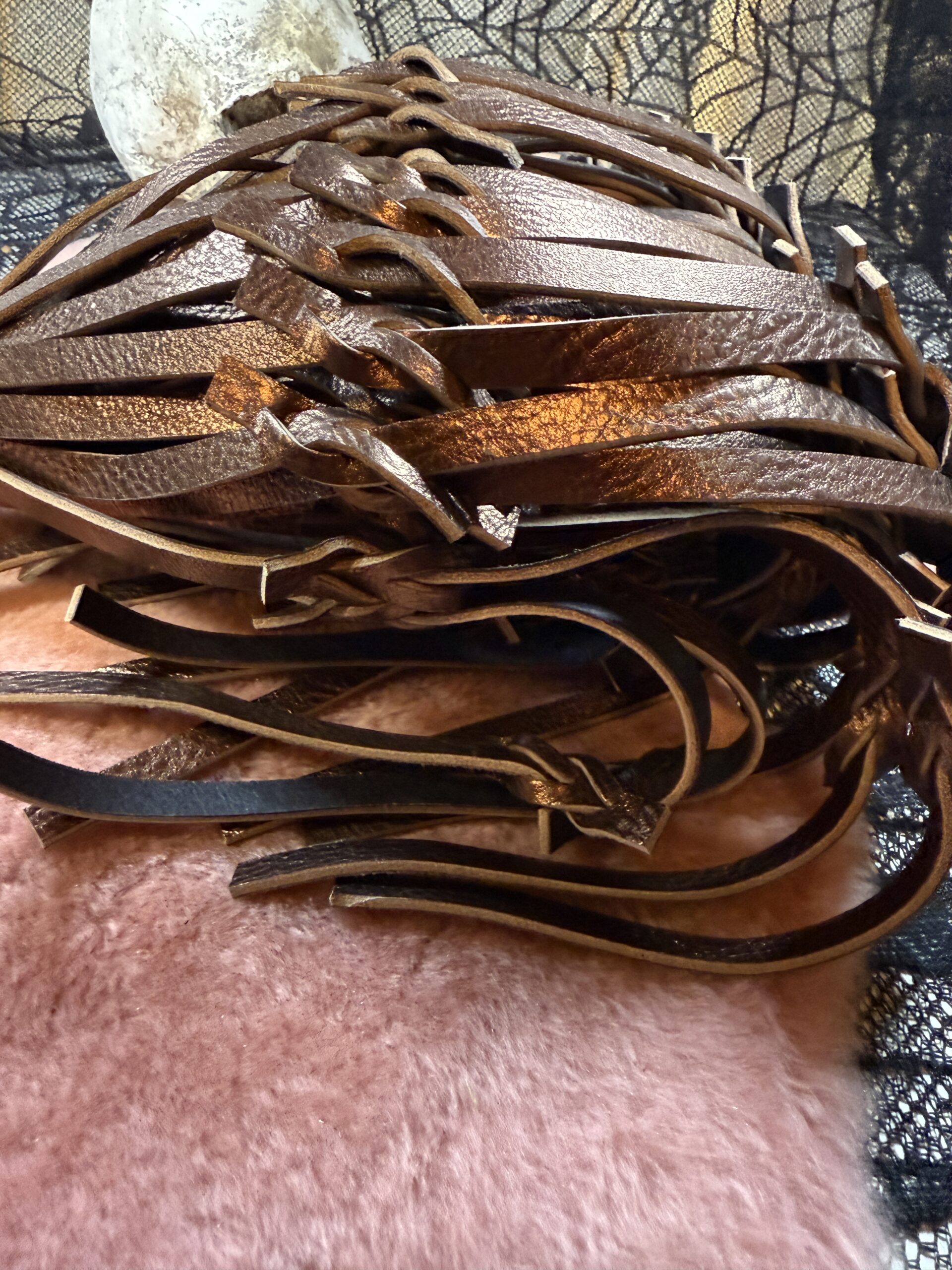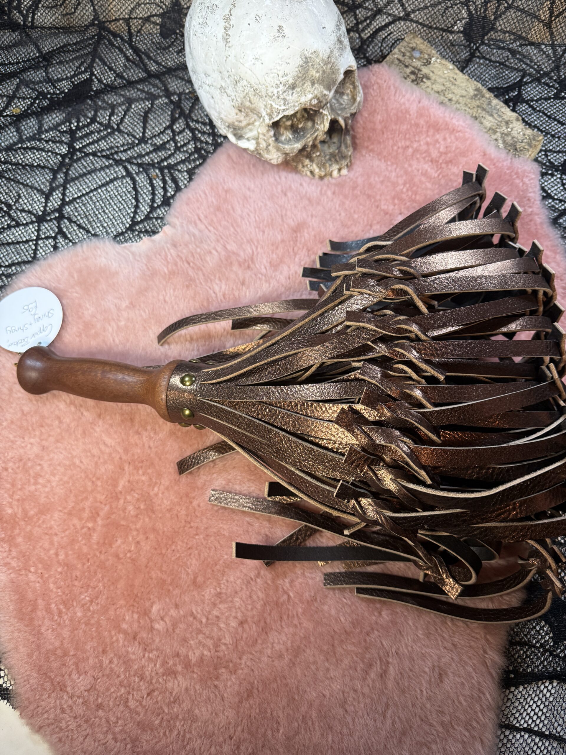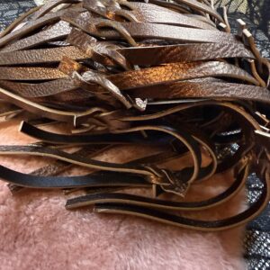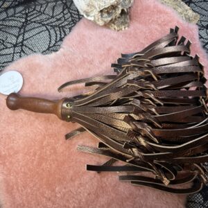 This Copper B*stard flogger is made from 2.2mm thick copper coloured leather. It features 52 narrow falls that are 44cm long, with interlinked sections and straight tips. This will give a very stingy and thuddy sensation with a delicious afterbite. The flogger is seated in a recycled wood handle.