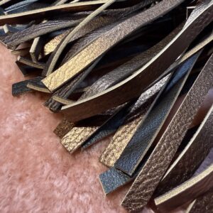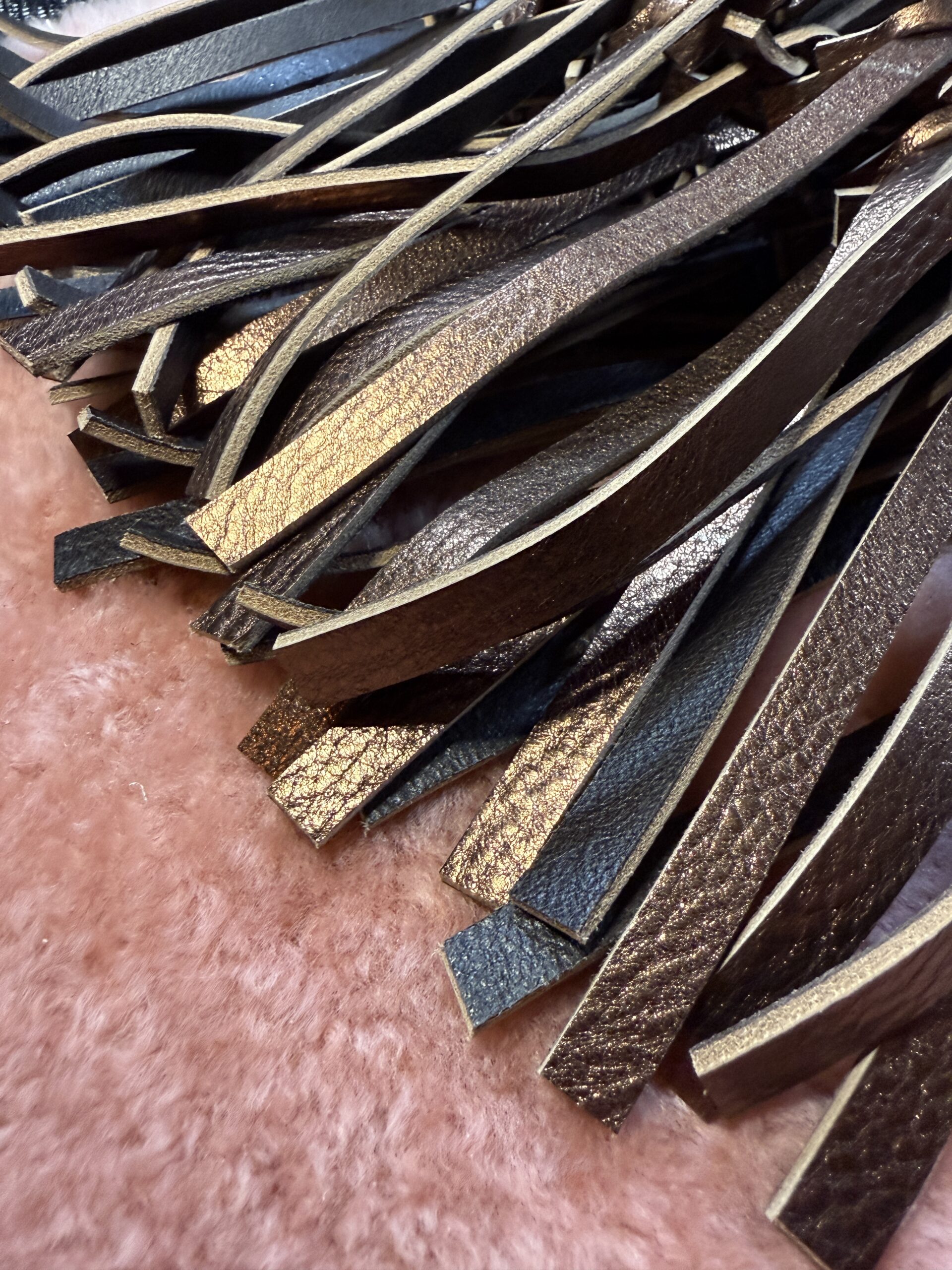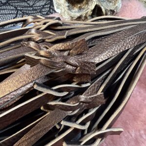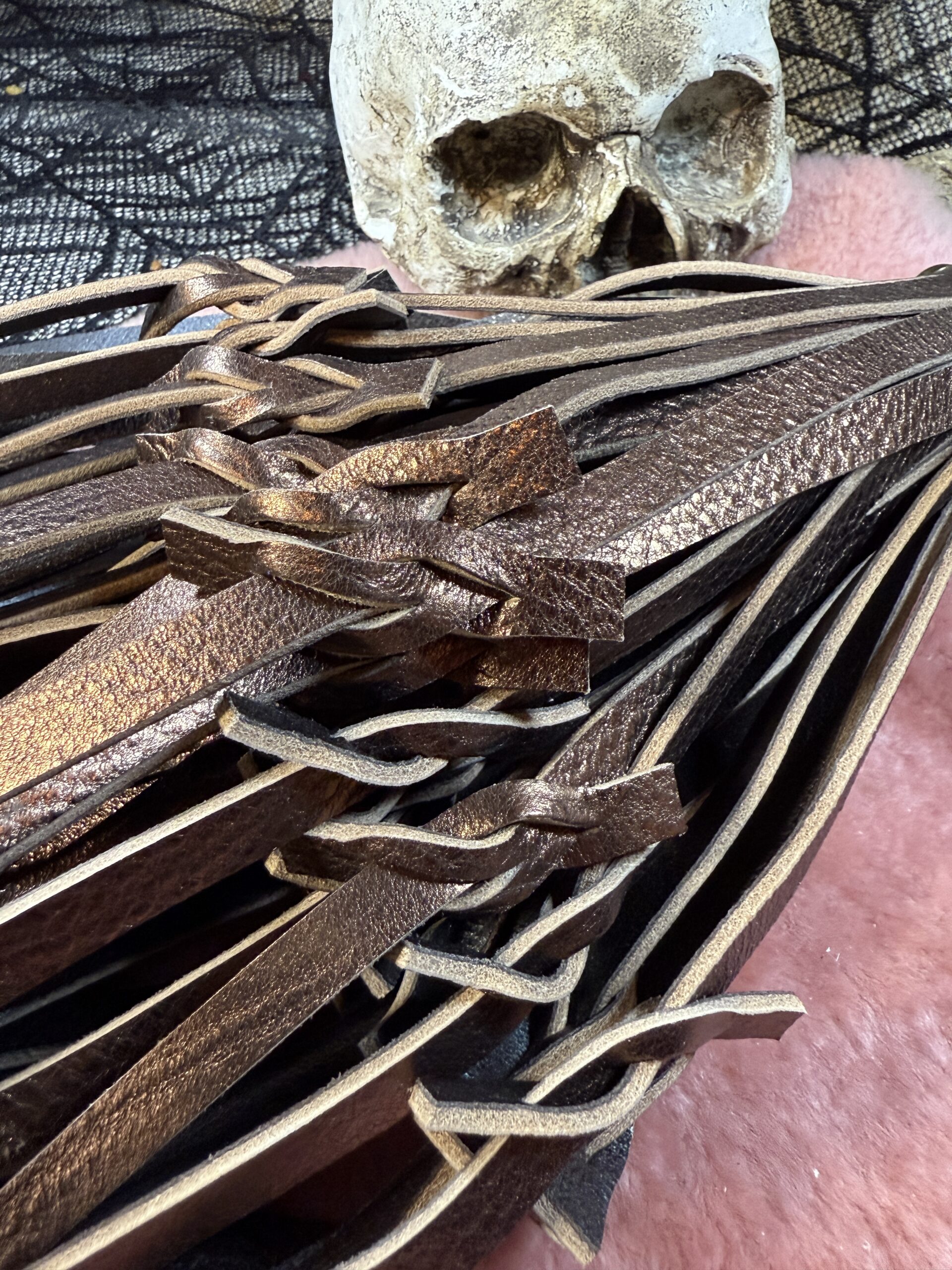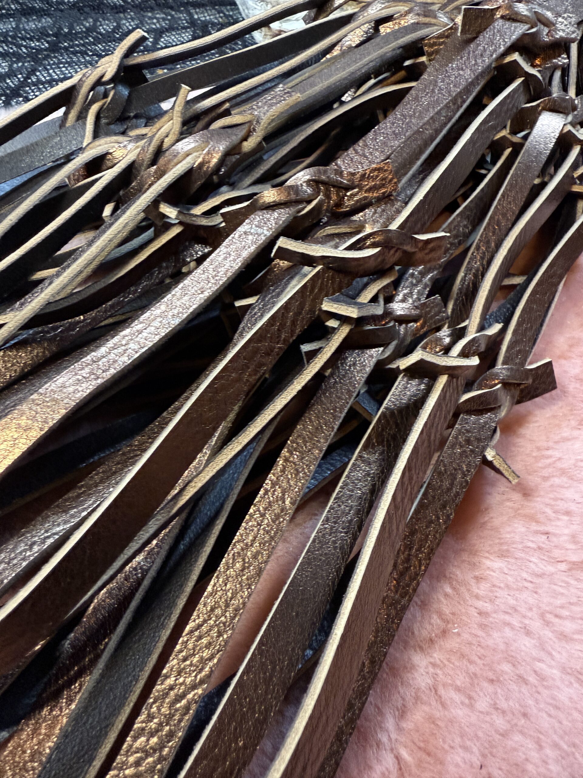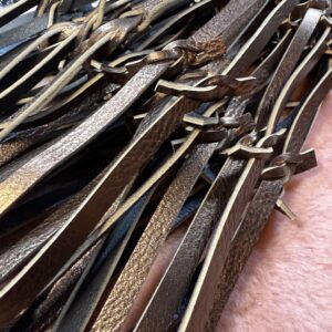 This Copper B*stard flogger is made from 2.2mm thick copper coloured leather. It features 52 narrow falls that are 44cm long, with interlinked sections and straight tips. This will give a very stingy and thuddy sensation with a delicious afterbite. The flogger is seated in a recycled wood handle.