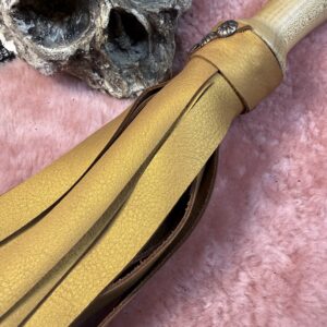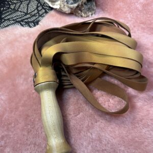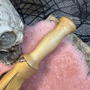 This flogger is finished with a hand-turned reclaimed handle and hanging ring. The handle grip measures 15cm overall.
