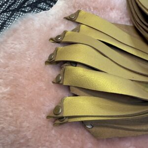 The Copper Countess flogger is crafted from 1mm thick, soft, and senusal metallic coloured leather. This flogger has 28 2cm wide falls that are 41cm long with folded angled tips. secured with a glued Chicago screw This flogger is elegant with a light to middle weight flogger, with a little extra bite from the ends.