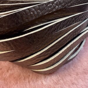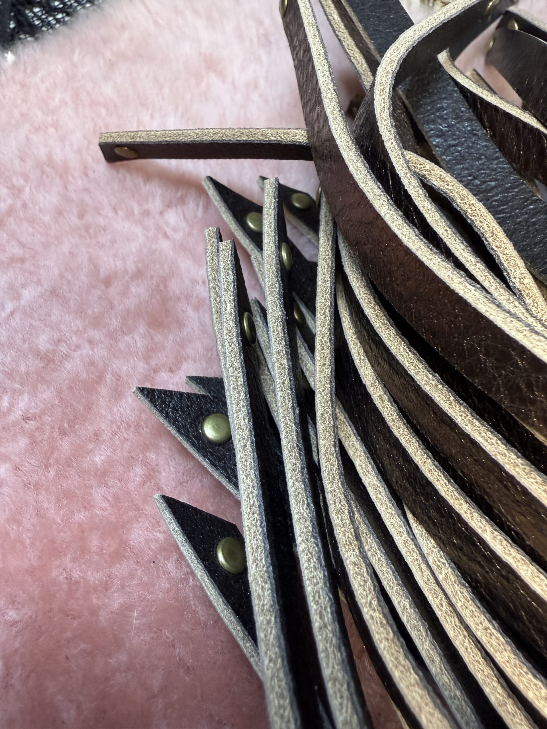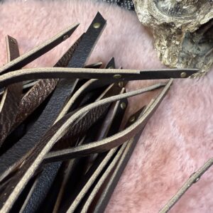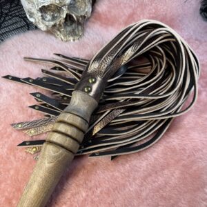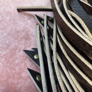 This Copper Kisses flogger is made from a 3mm thick heavy metallic copper coloured leather This flogger has 40 falls that are 48cm long and 1cm wide. The ends are angled for stingy bite with a rivet for extra sensation This is a heavyweight flogger that is both thuddy and stingy due to the angled ends and thin falls. It weighs in at 1 lb and 7oz