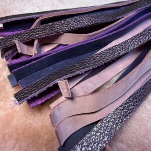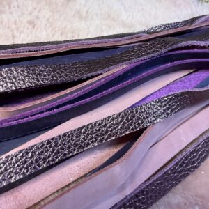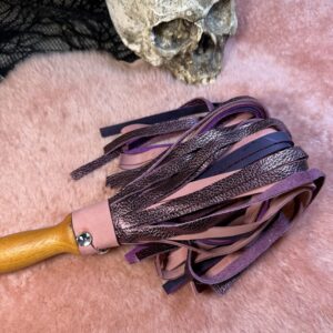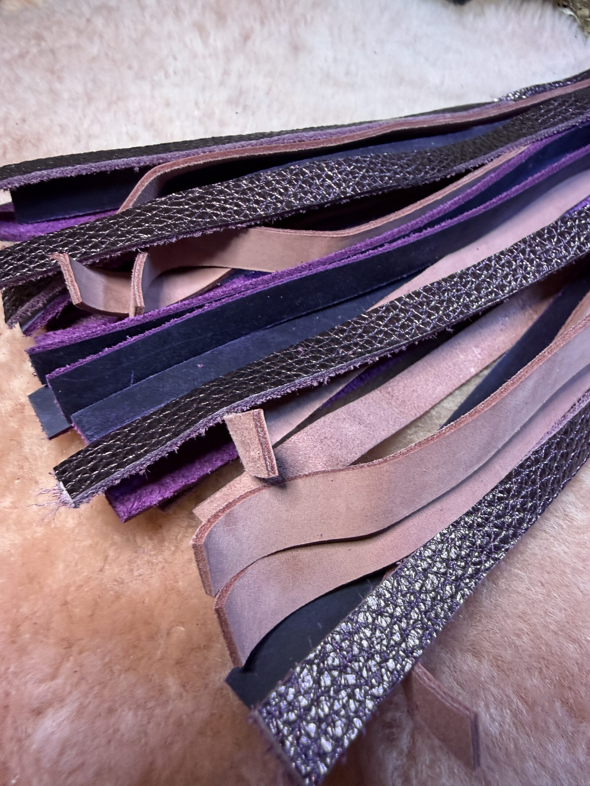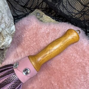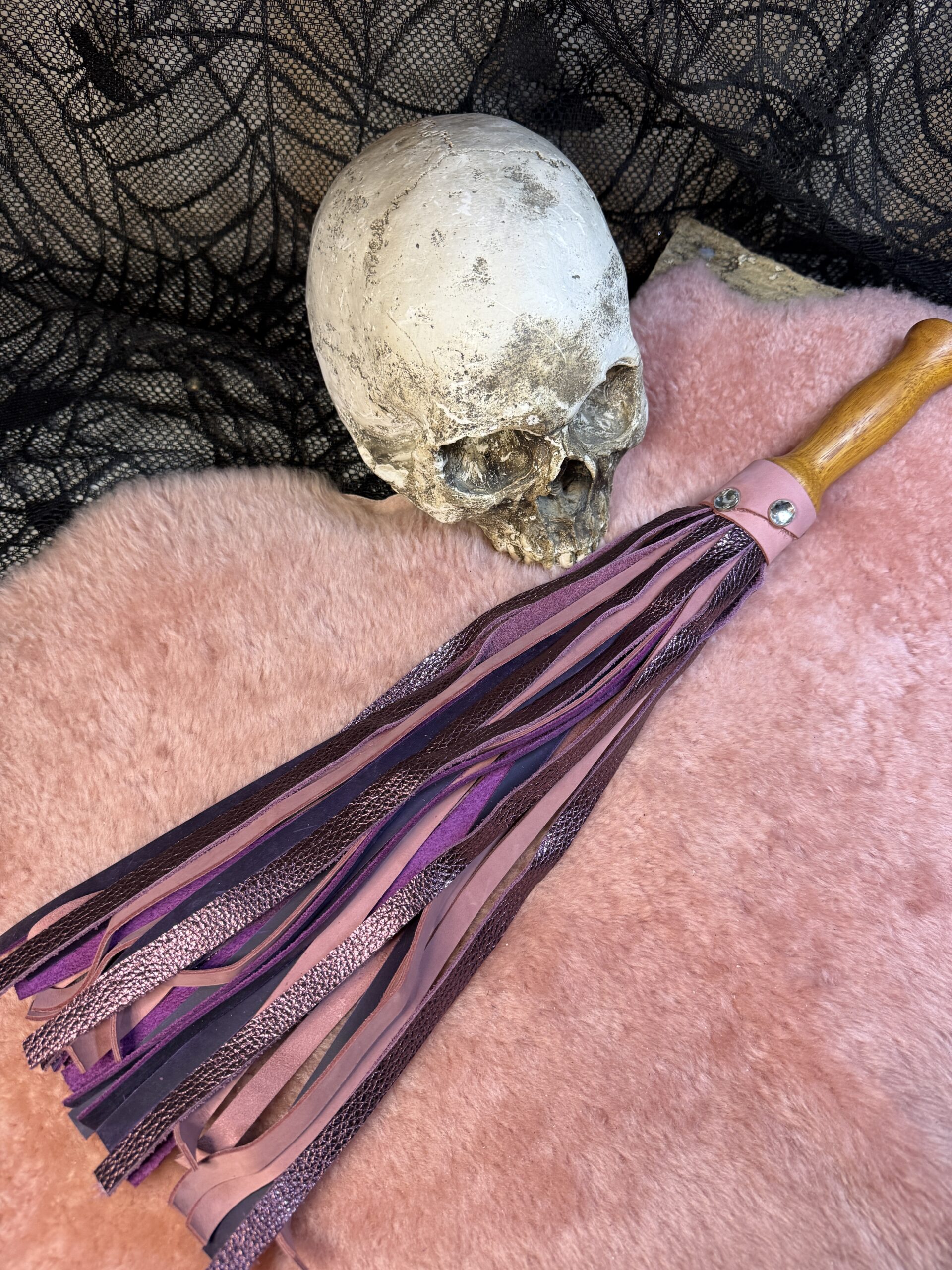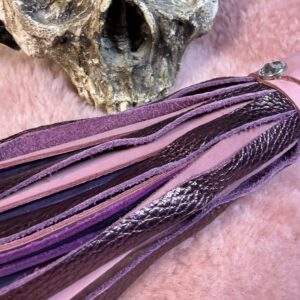 The Gentle Authority flogger is made from Amethyst Love leather, pink nubuck and purple pull up leather. This flogger features 40 1cm wide falls that are 34cm long . This is a mid weight flogger will give you a light to medium thuddy sensation. All seated in a reclaimed hardwood handle measuring 14cm overall.