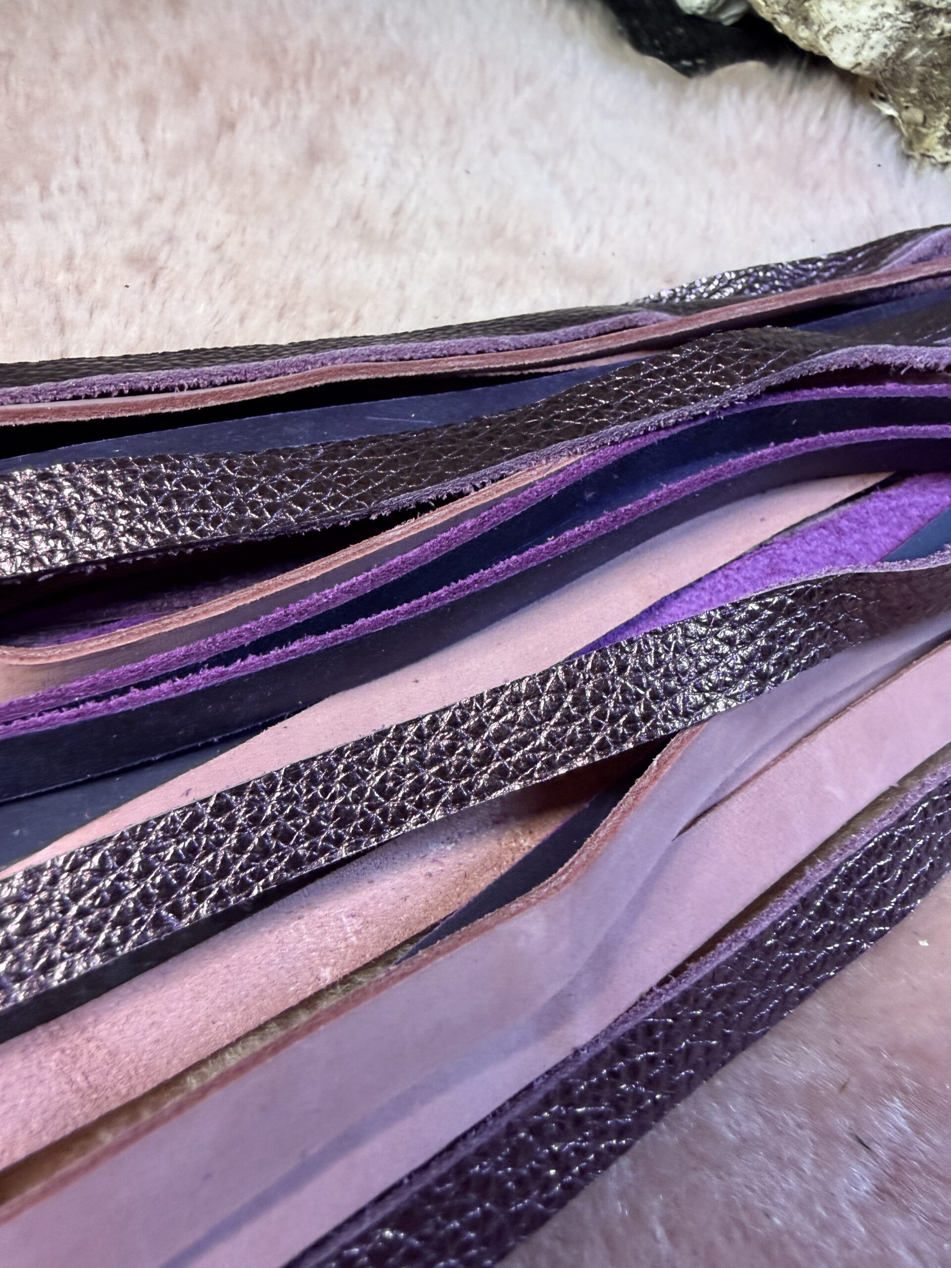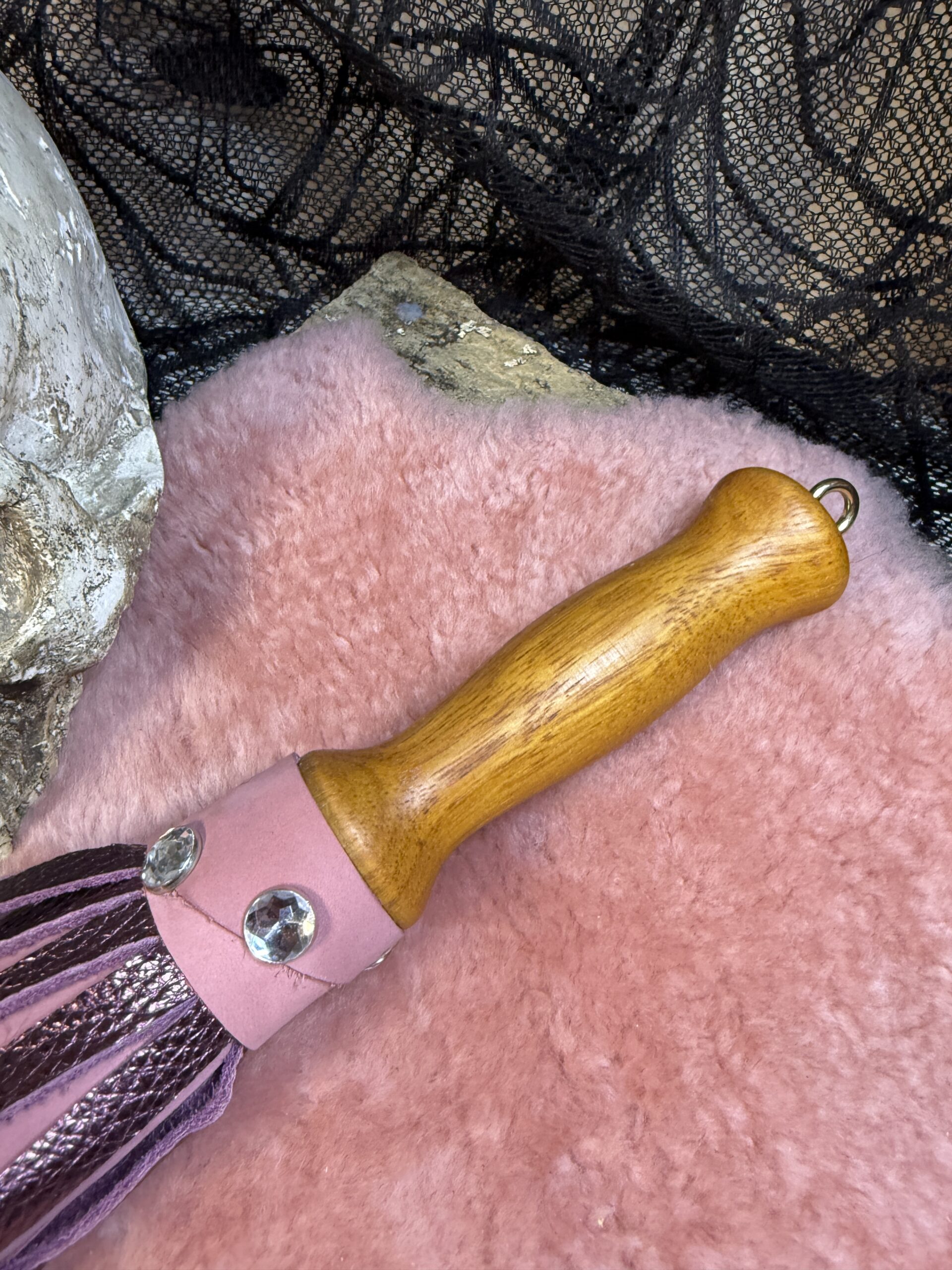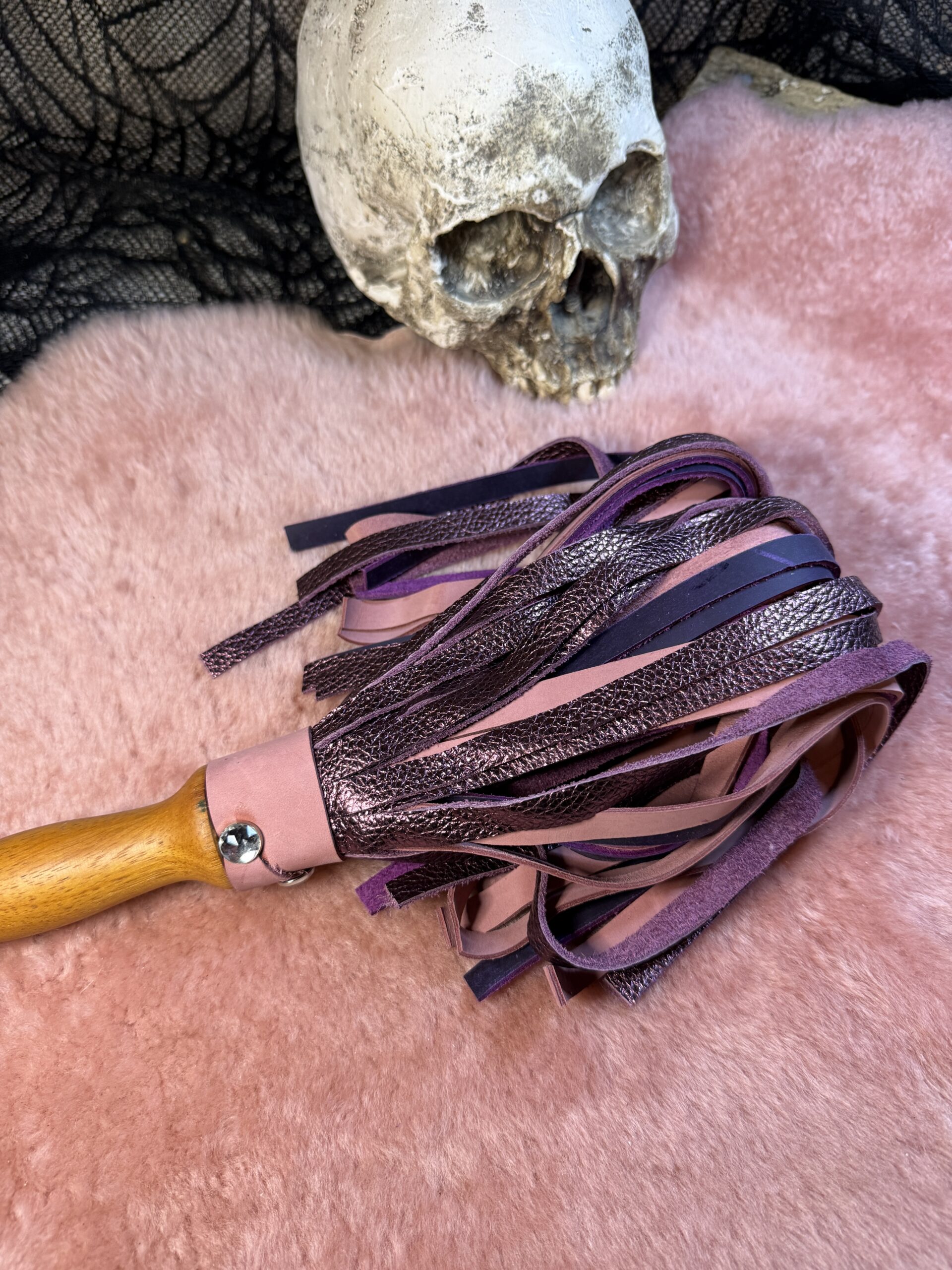 The Gentle Authority flogger is made from Amethyst Love leather, pink nubuck and purple pull up leather. This flogger features 40 1cm wide falls that are 34cm long . This is a mid weight flogger will give you a light to medium thuddy sensation. All seated in a reclaimed hardwood handle measuring 14cm overall.
