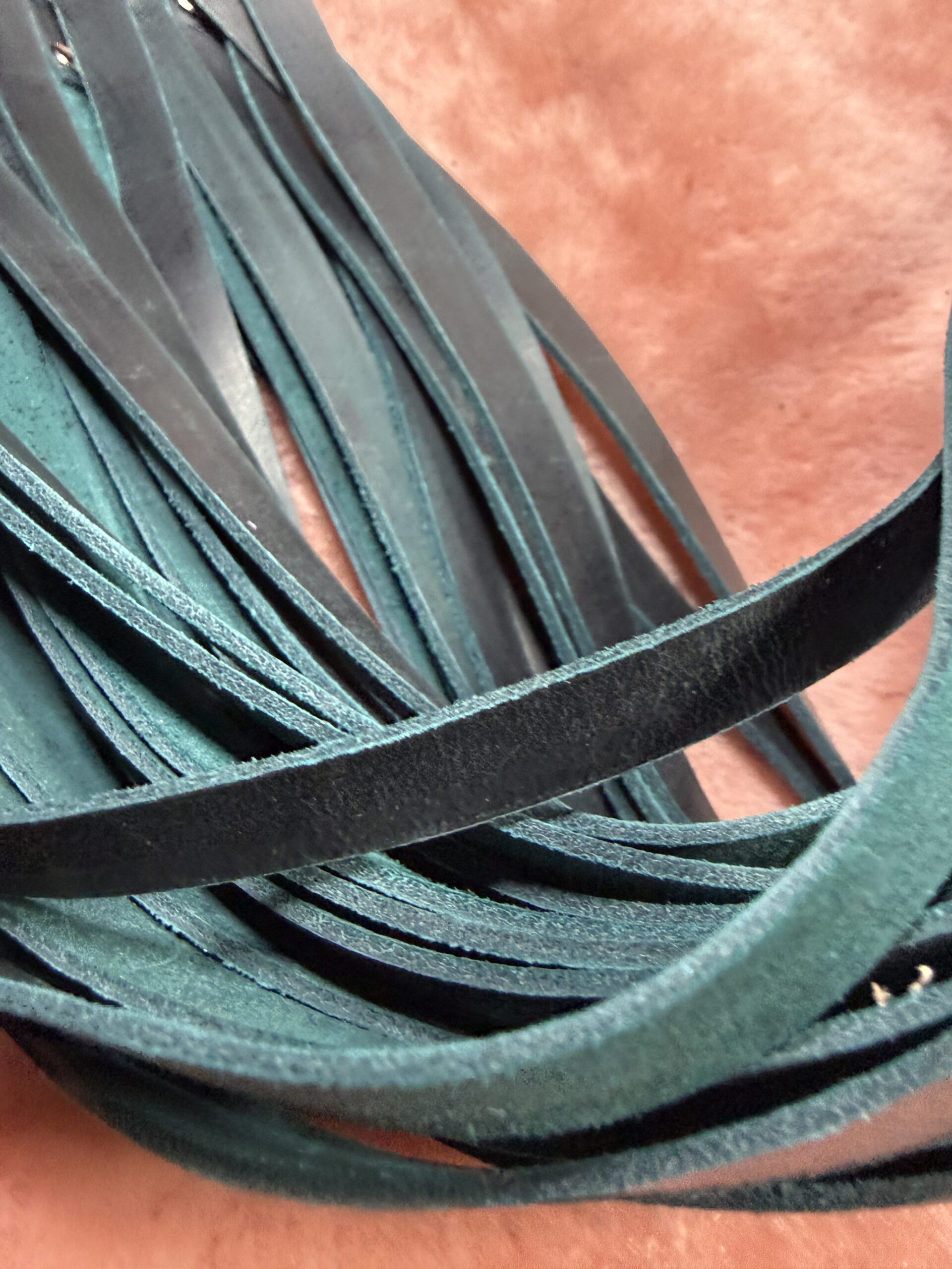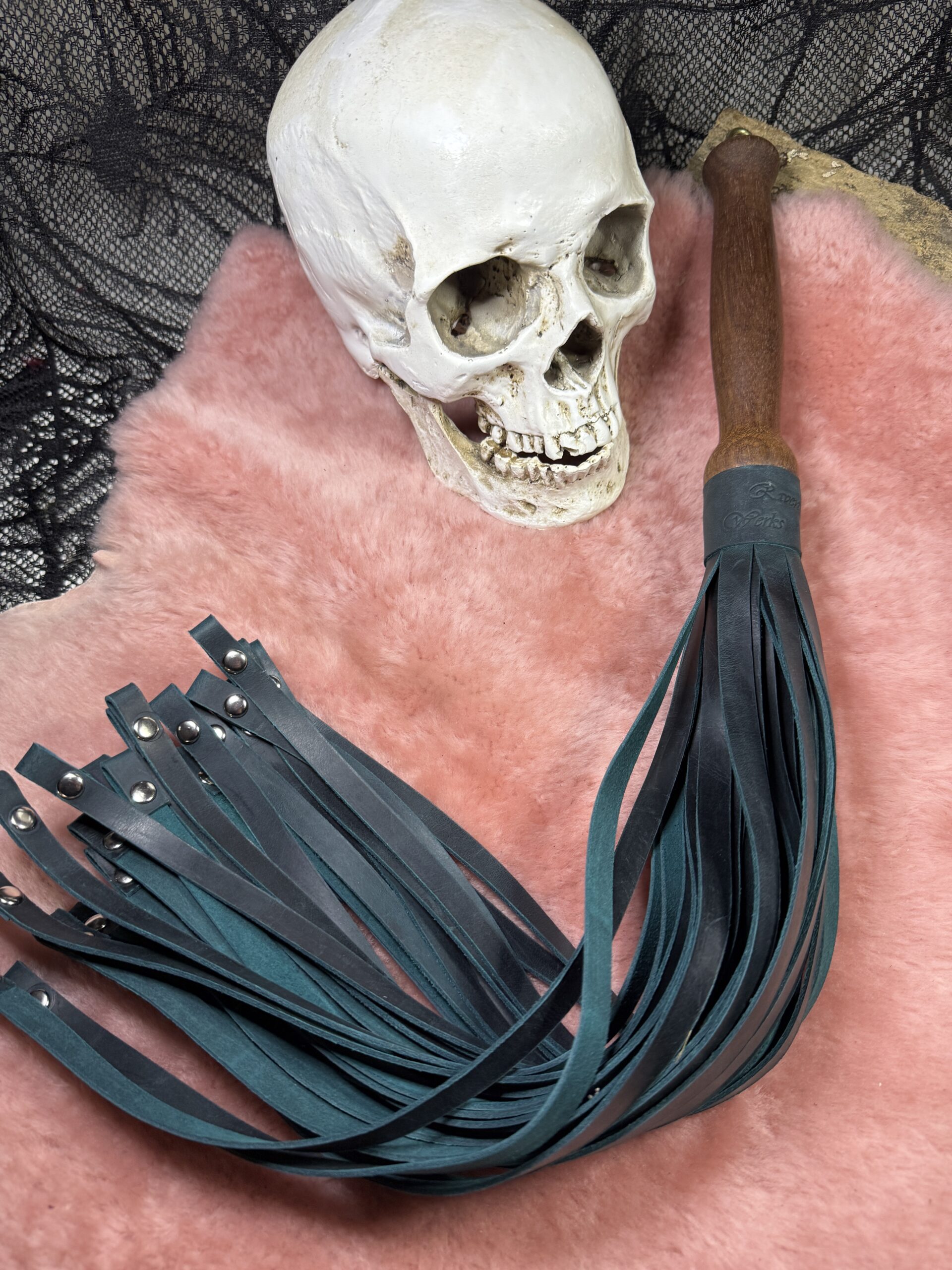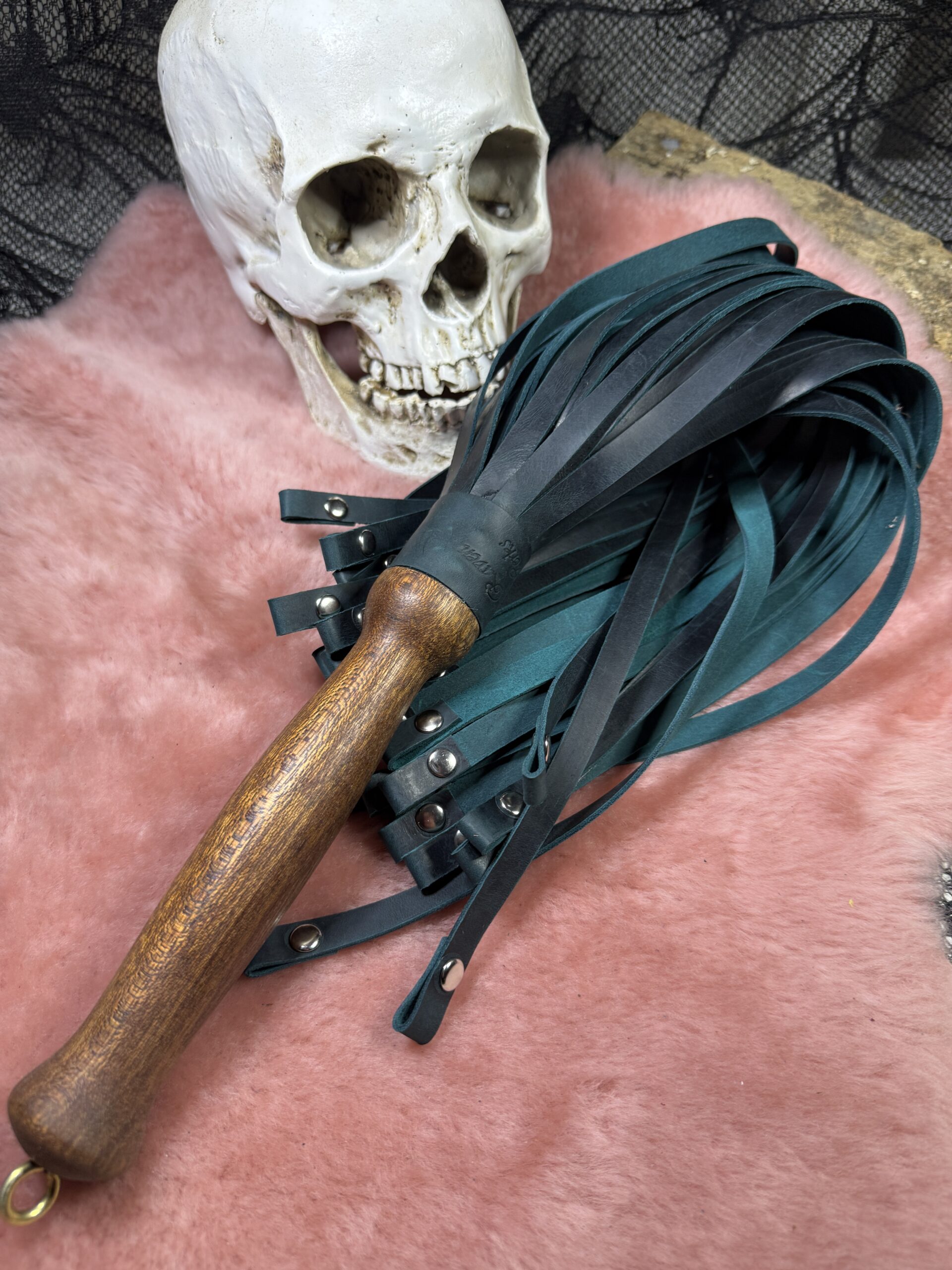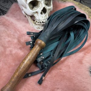 The Green Requital flogger is made from an earthy green coloured pull up leather. This flogger features 37 1cm wide falls that are 40cm long . This flogger will give you a stingy thuddy sensation from the doubled and riveted ends. All seated in a reclaimed hardwood handle measuring 16cm