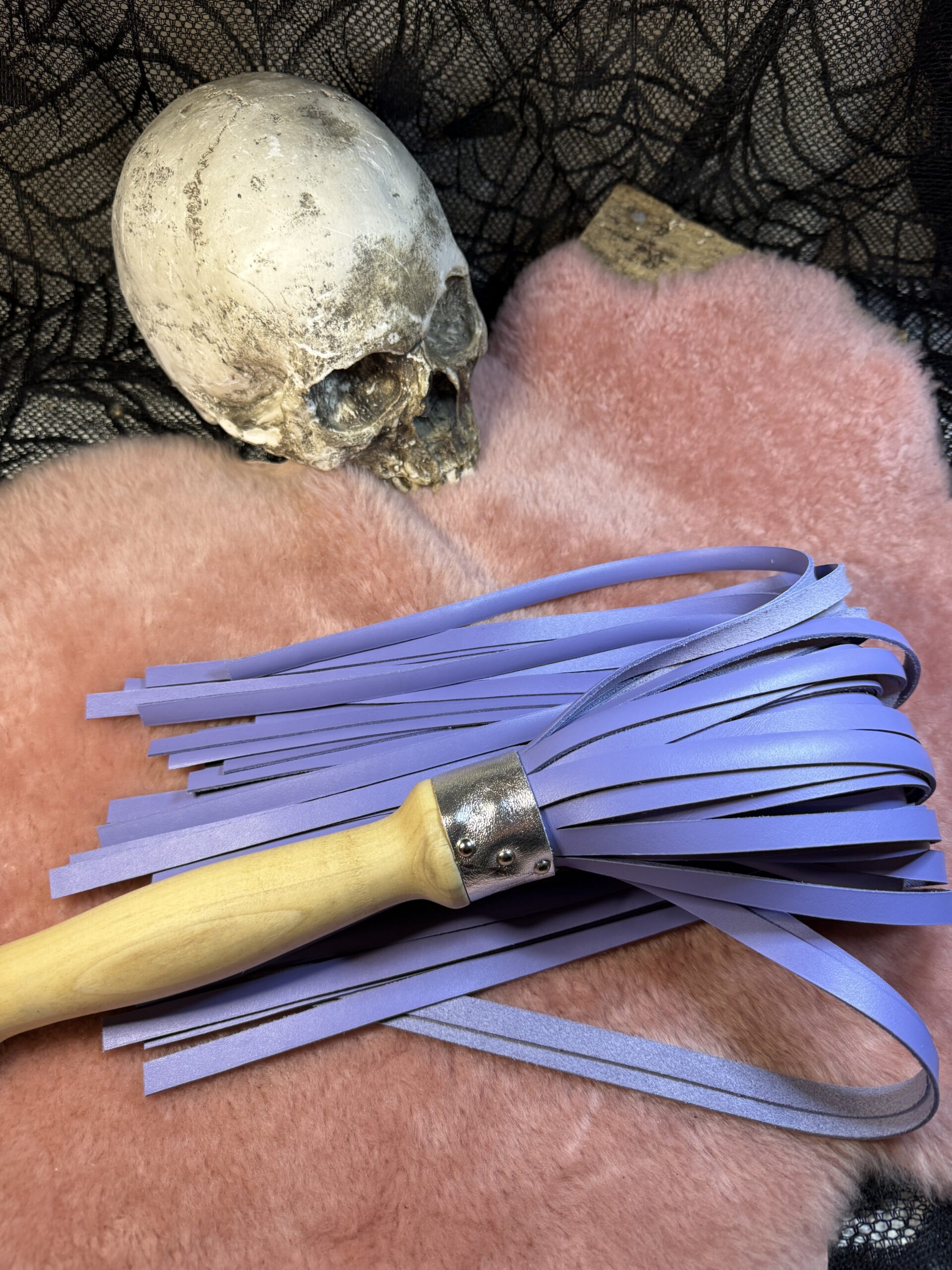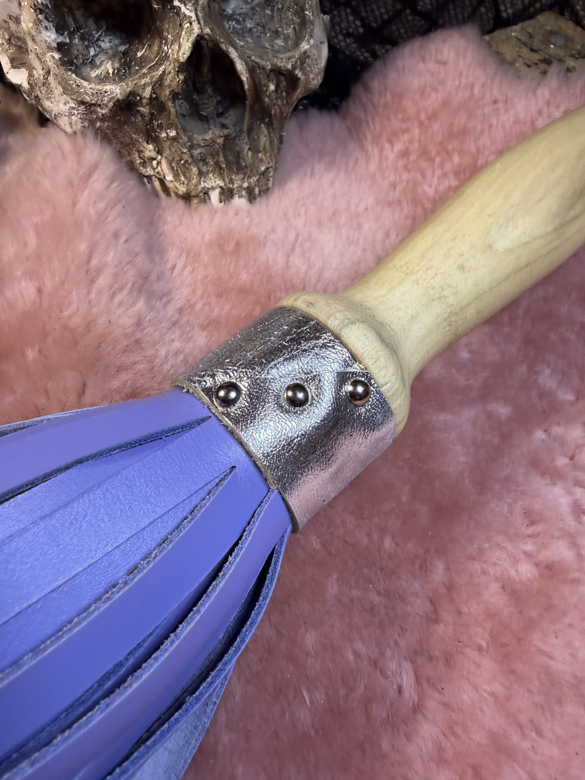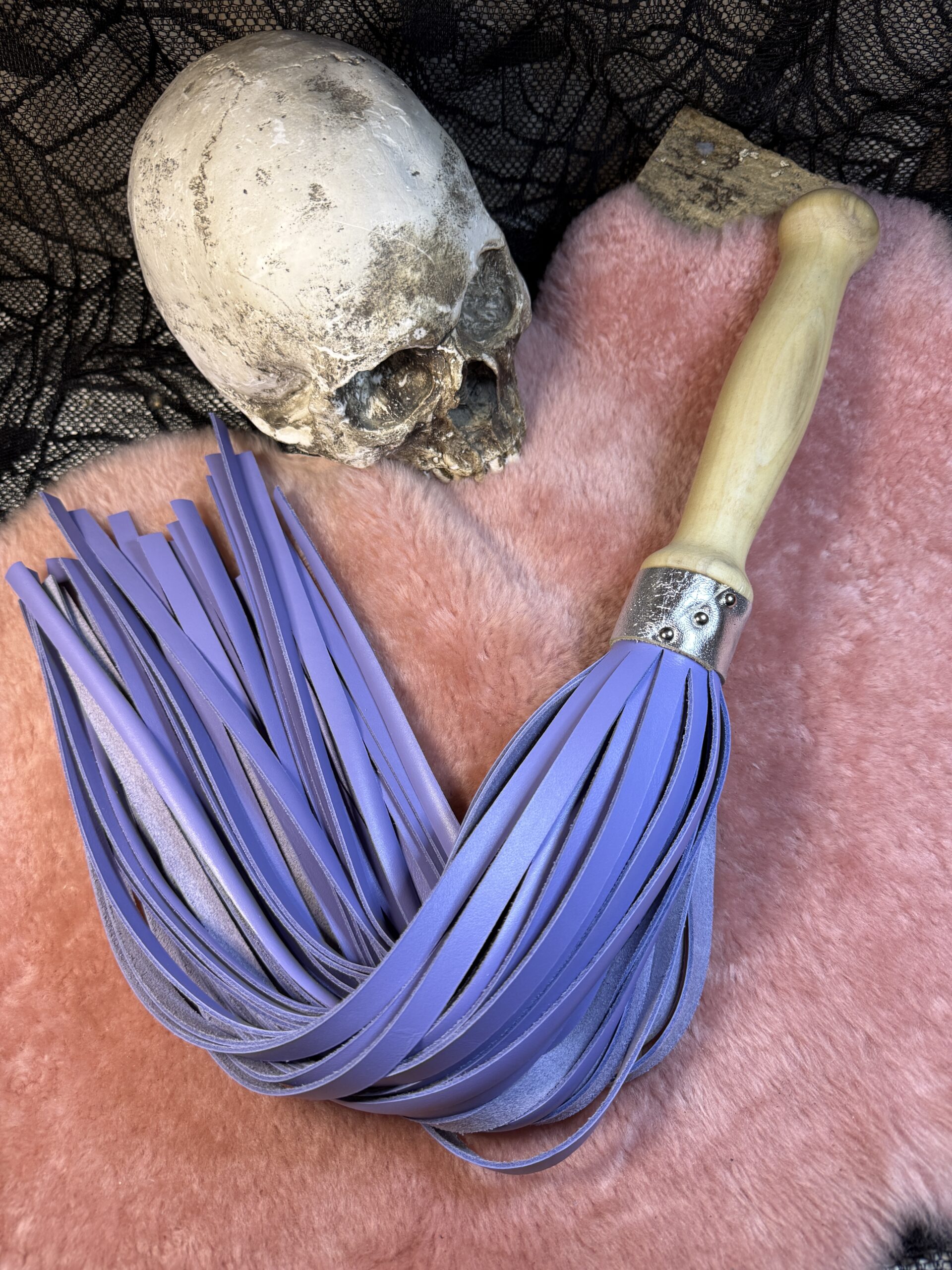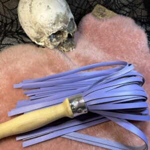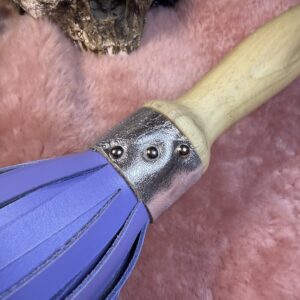 The Lavender flogger is made from lavender blue cowhide leather with a silver trim. This flogger features 60 1cm wide falls that are 42cm long . This is will deliver a thuddy sensation with a nice little stingy afterbite . All seated in a reclaimed handle measuring 20cm overall.