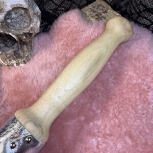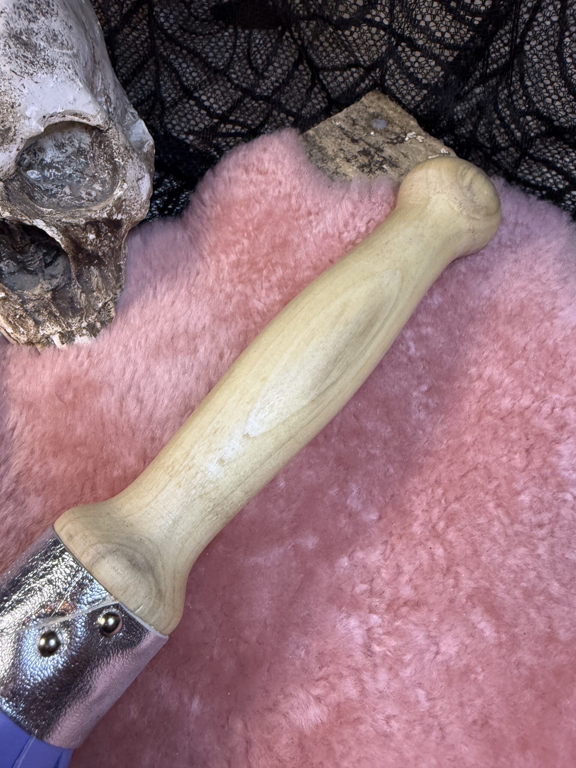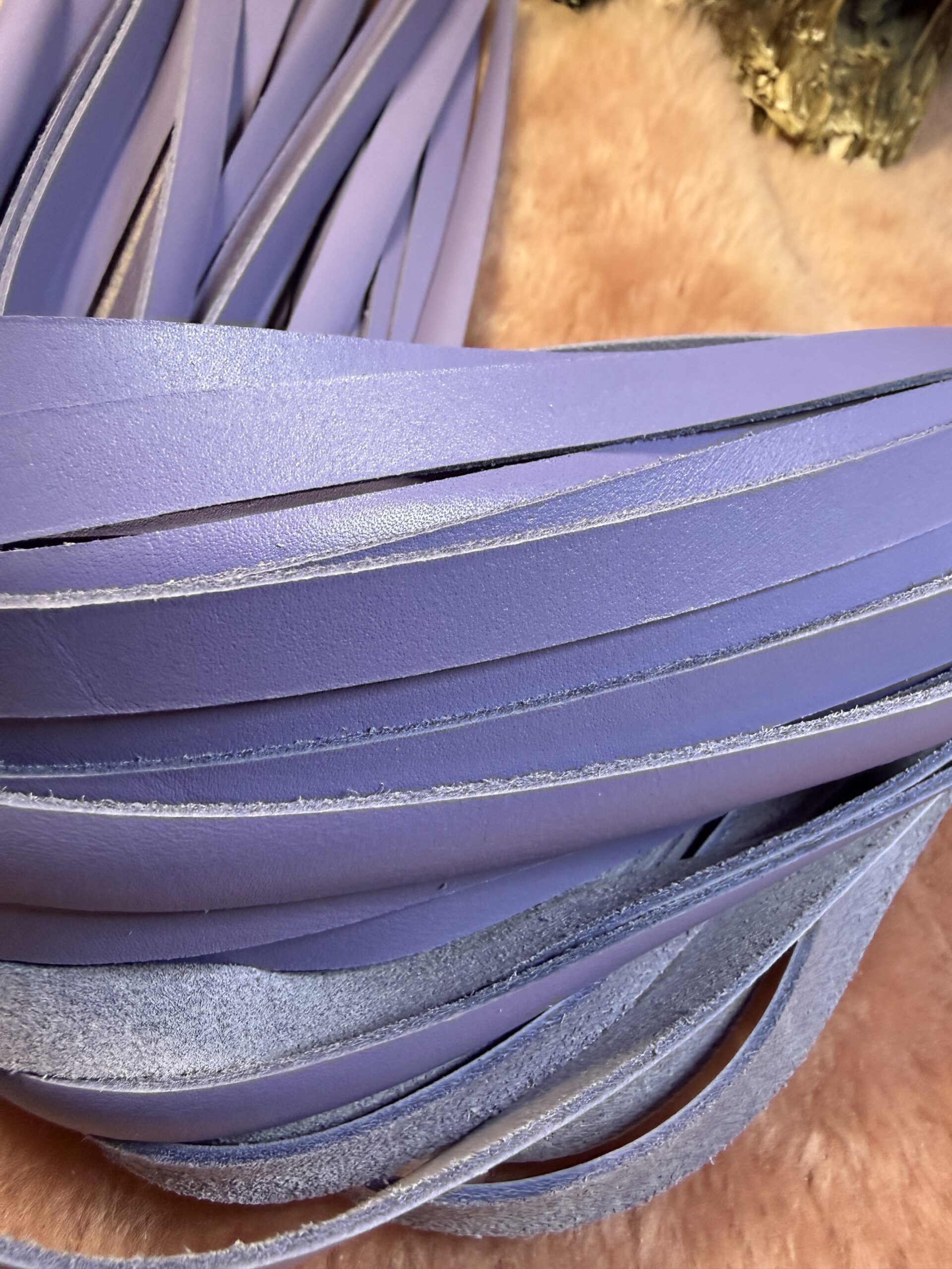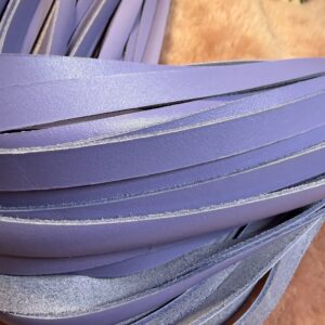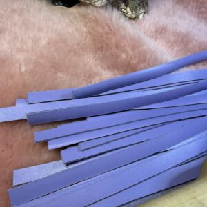 The Lavender flogger is made from lavender blue cowhide leather with a silver trim. This flogger features 60 1cm wide falls that are 42cm long . This is will deliver a thuddy sensation with a nice little stingy afterbite . All seated in a reclaimed handle measuring 20cm overall.