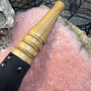 This flogger is finished with a hand-turned reclaimed handle and hanging ring. The handle grip measures 18cm overall.
