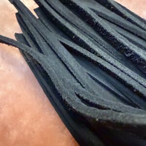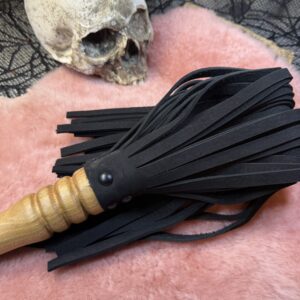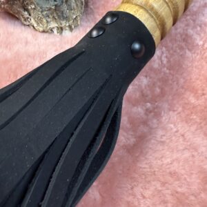 The Nubuck Night flogger is crafted from 2mm thick, soft, and senusal black nubuck leather. This flogger has 52 1cm wide falls that are 42cm long. This nubuck leather is soft and thuddy and a middleweight flogger