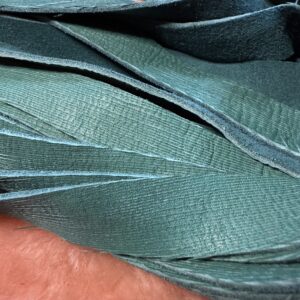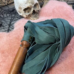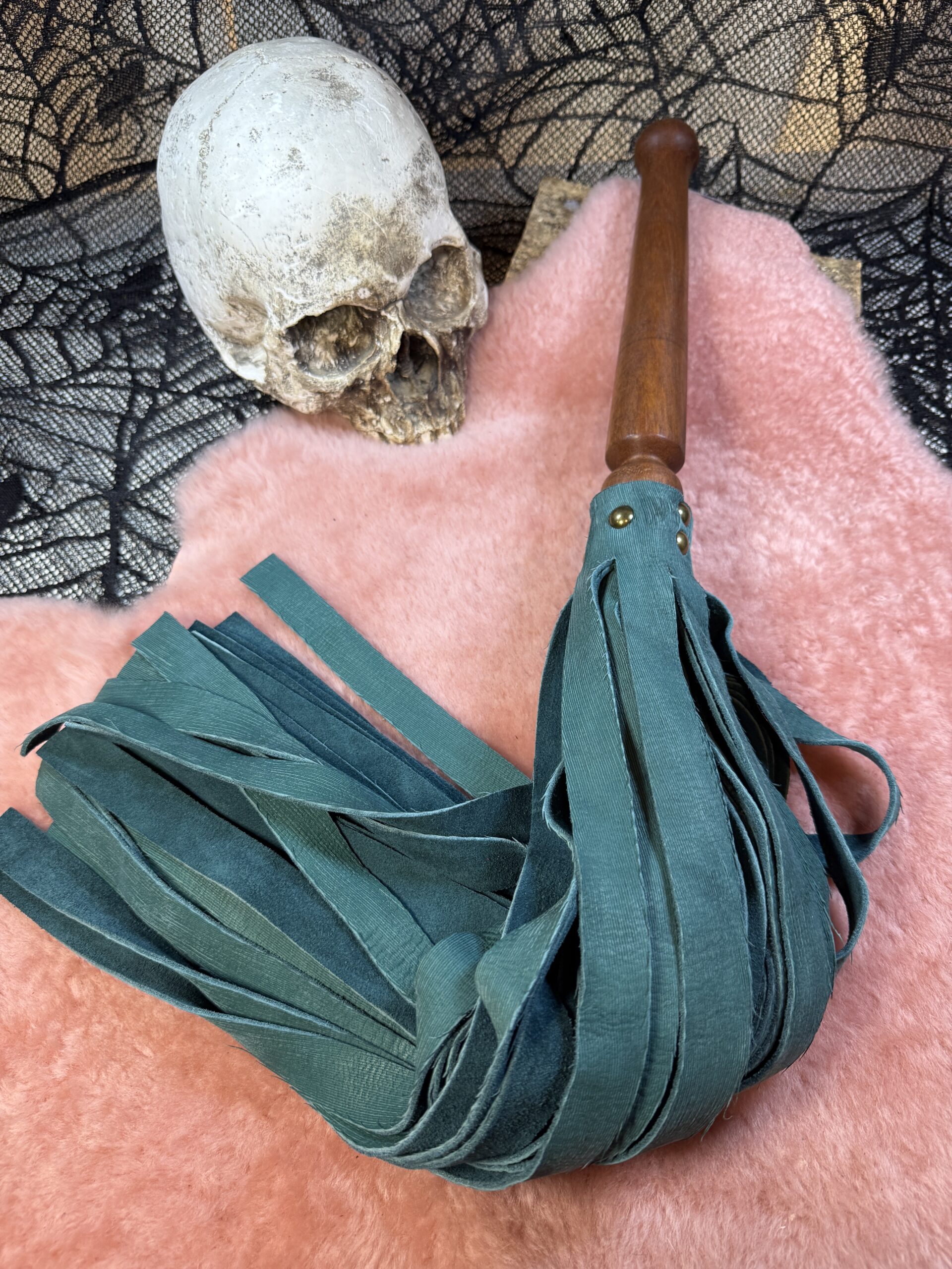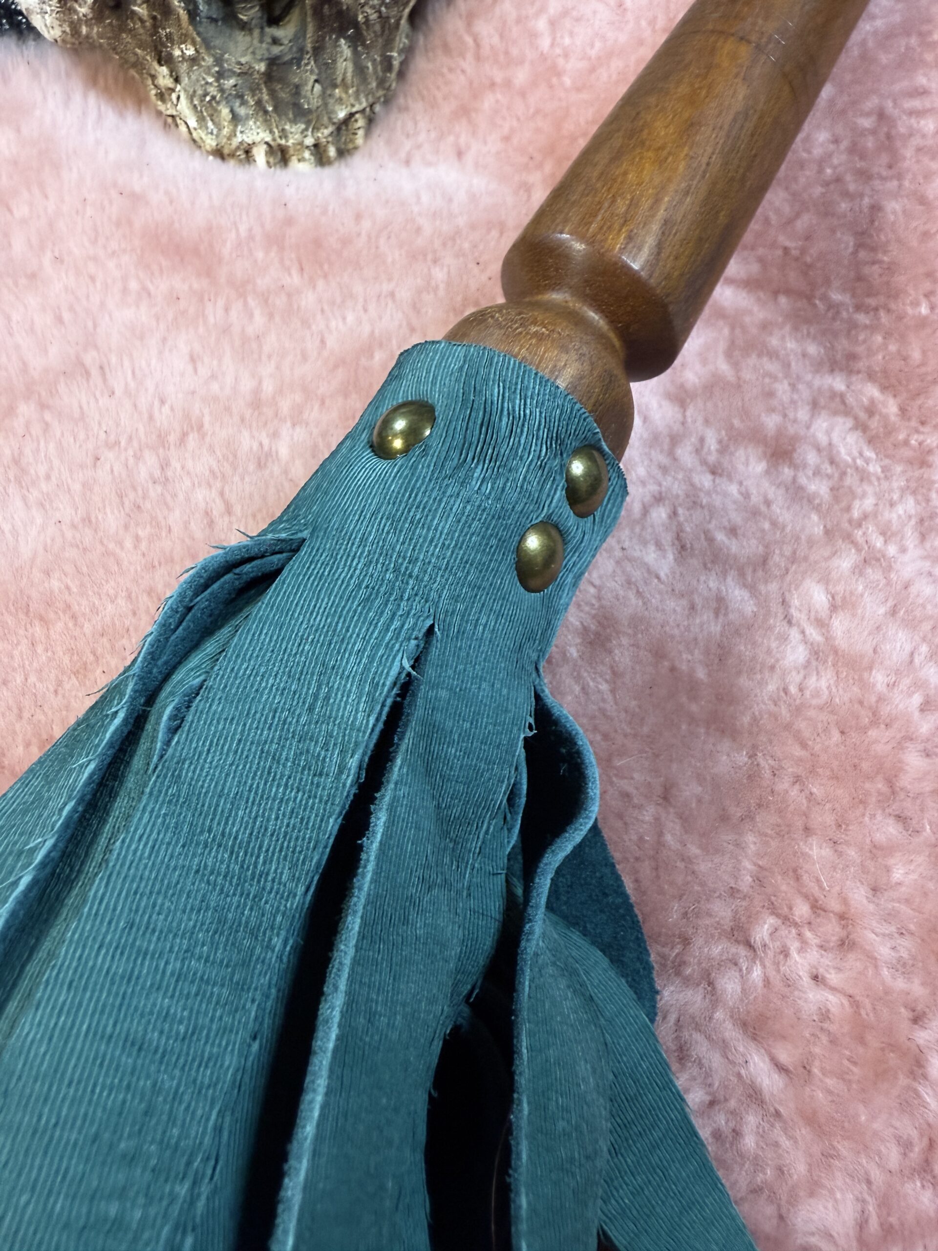 This Teal Teaser flogger is made from a super soft leather that almost feels softer than suede! This flogger has 42 2cm falls that are 45cm long. This is a medium to heavier weight flogger and will deliver a soft thuddy sensation