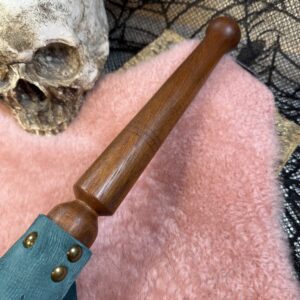 This flogger is finished with a hand-turned reclaimed character reclaimed spalted handle. The handle grip measures 23cm overall. Due to the embossed pattern on this soft leather it can show a slightly frayed like edge but with use that will disappear..