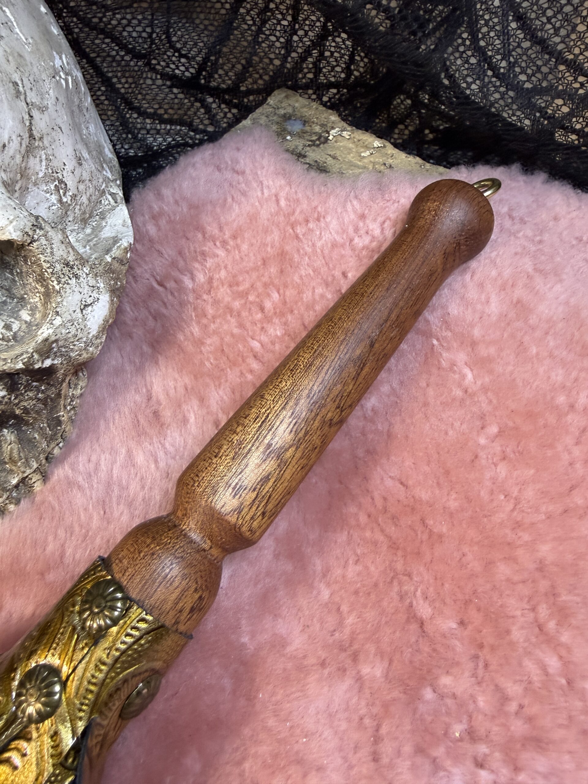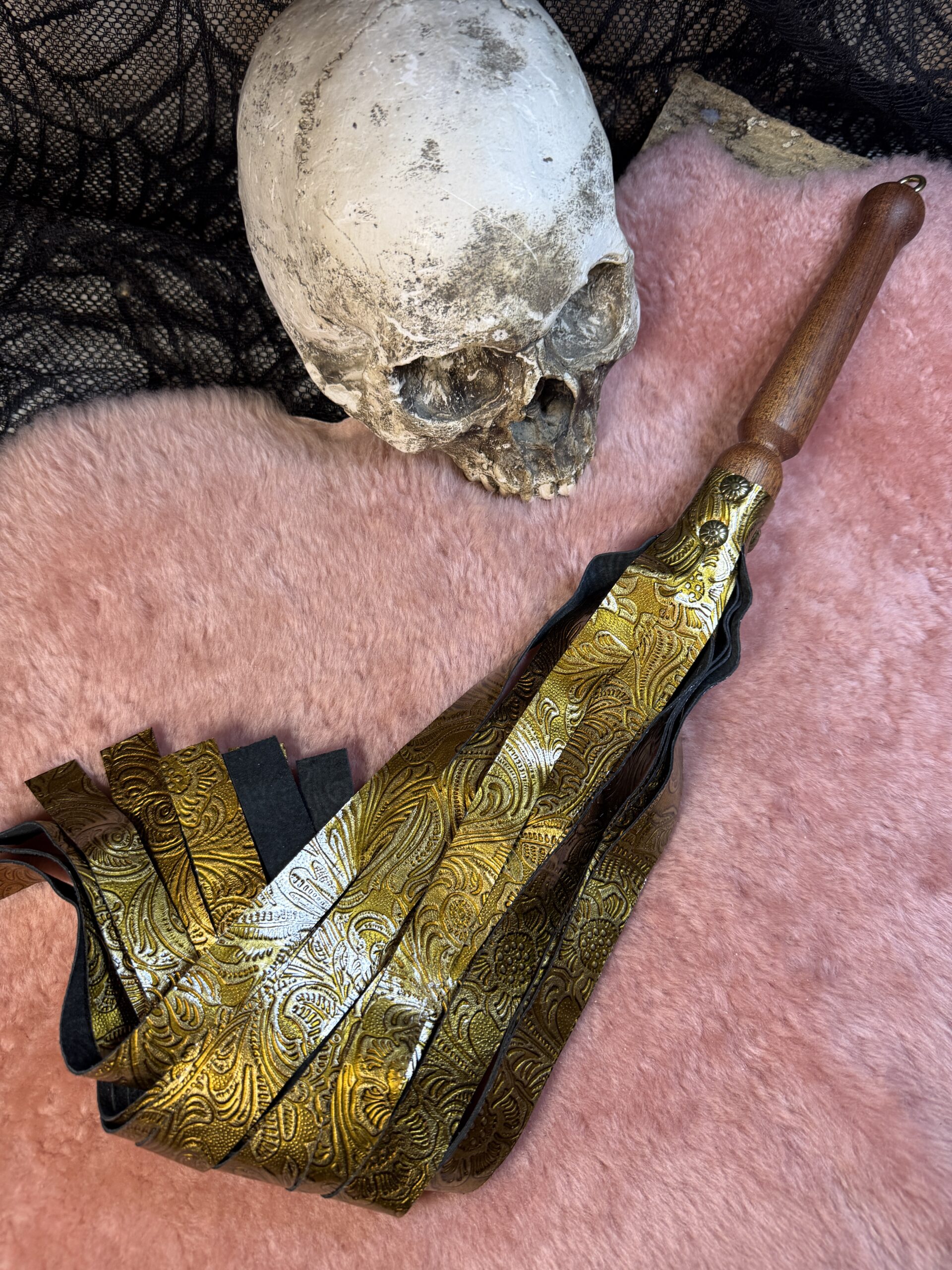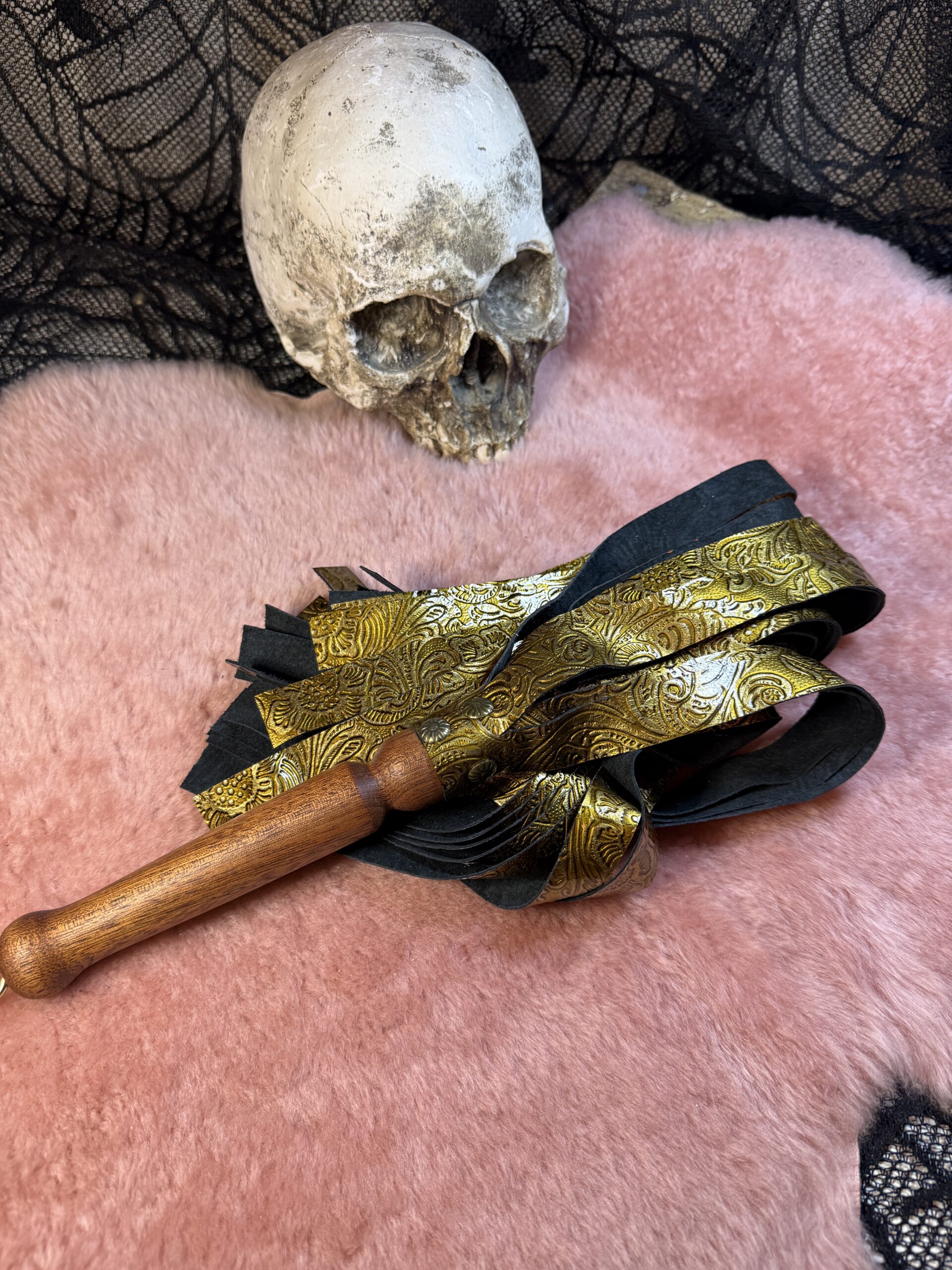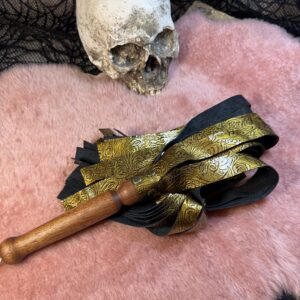 The Victorian Whisper flogger is made black kid leather with a brass patent finish with Victorian inspired swirls. This flogger features 26 2cm wide falls that are 40cm long . This flogger will give you a light and sensual sensation. All seated in a reclaimed hardwood handle measuring 15cm