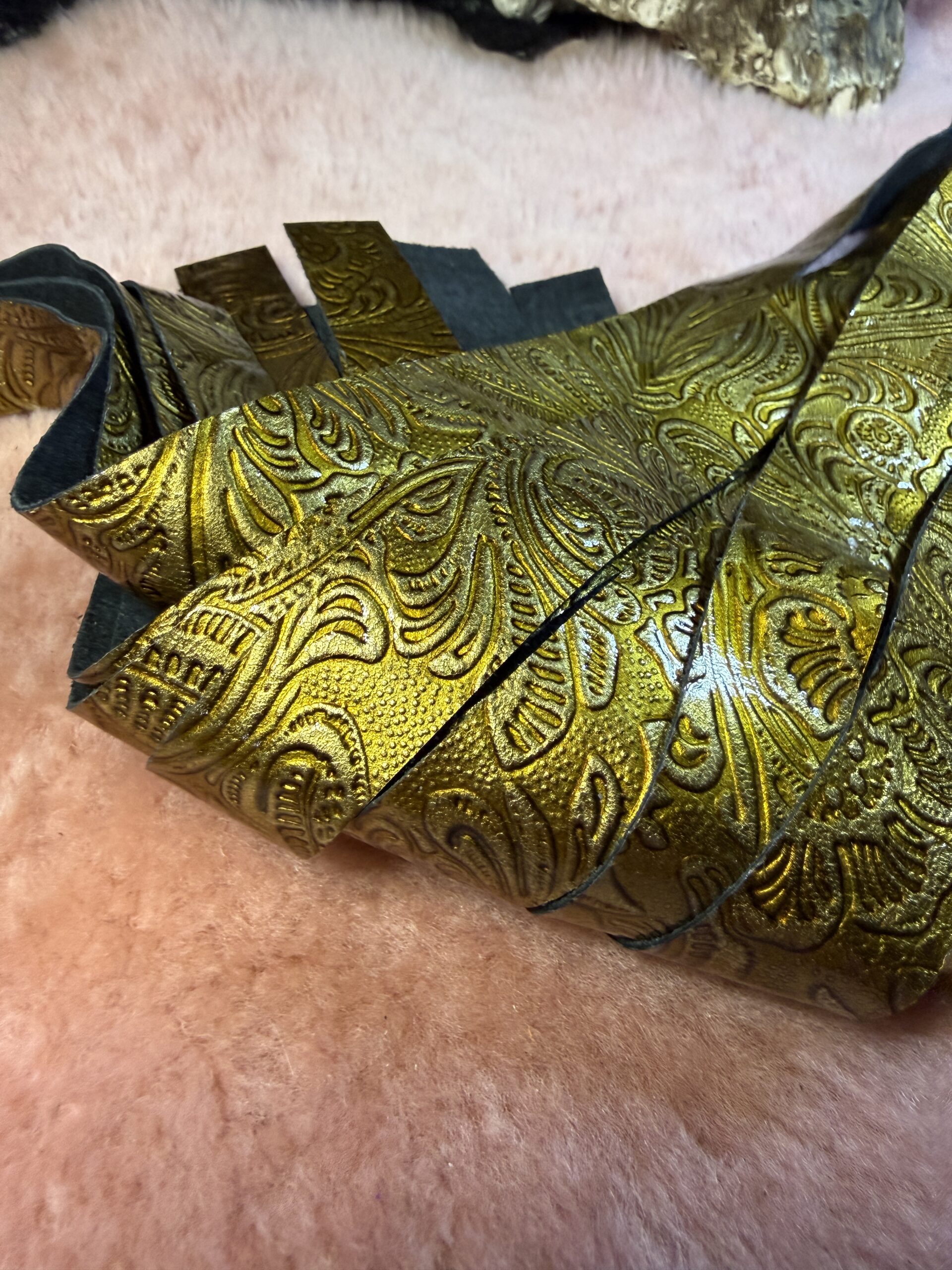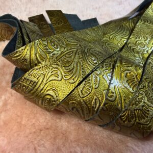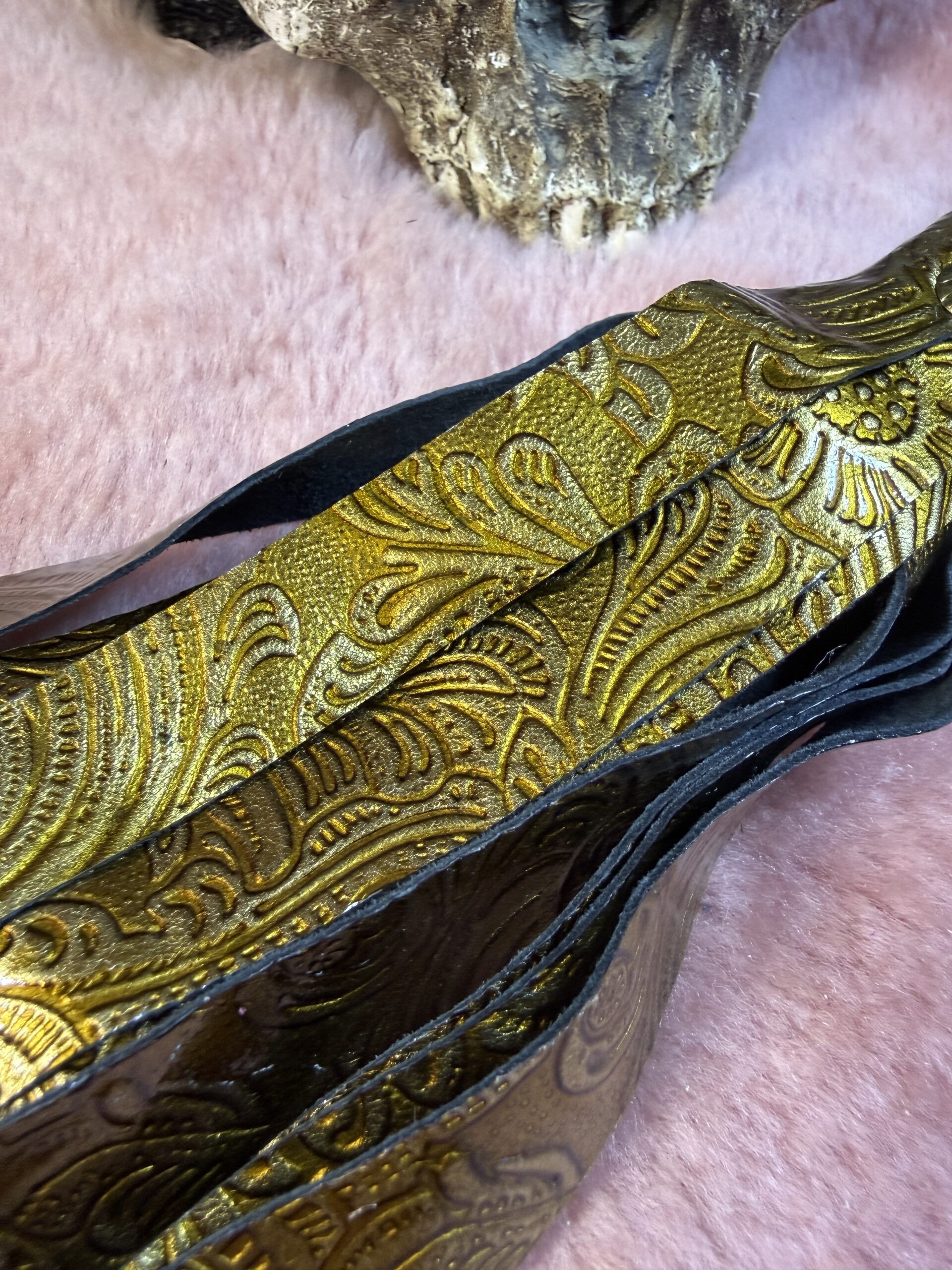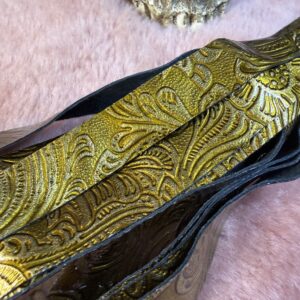 The Victorian Whisper flogger is made black kid leather with a brass patent finish with Victorian inspired swirls. This flogger features 26 2cm wide falls that are 40cm long . This flogger will give you a light and sensual sensation. All seated in a reclaimed hardwood handle measuring 15cm
