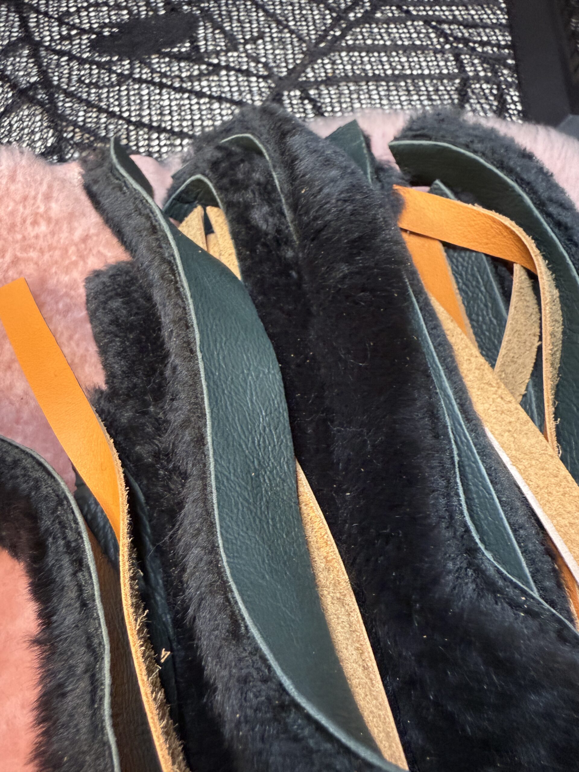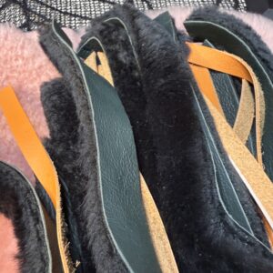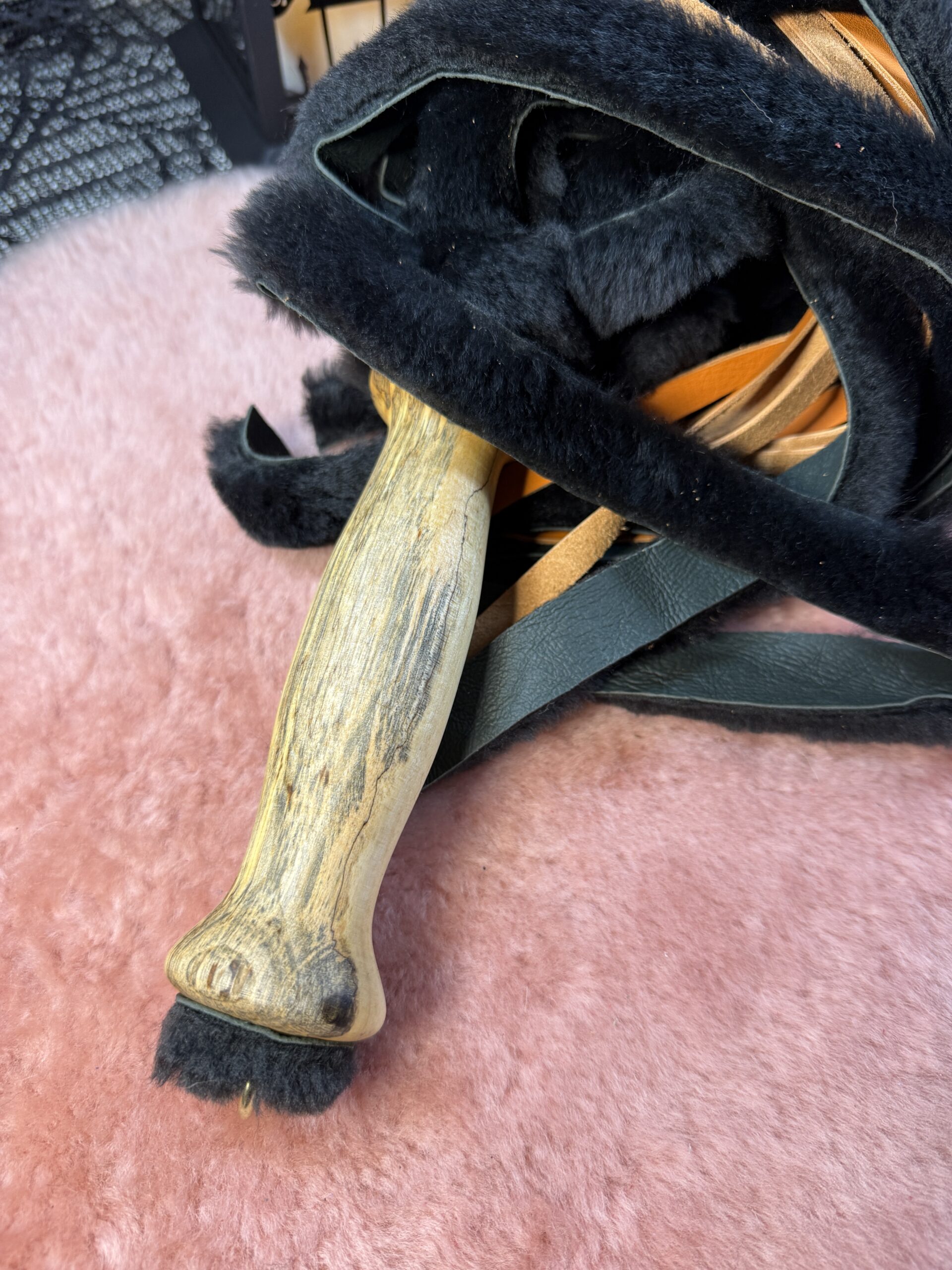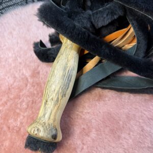 This Autumn’s Falling flogger is made from deep green double-sided sheepskin with an orange leather core. This flogger has 38 falls that are 38cm long. This is a light to medium-weight flogger that can be sensory or light thuddy depending on how you use it.