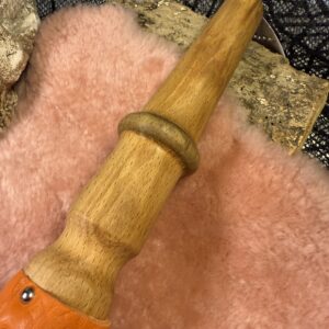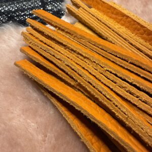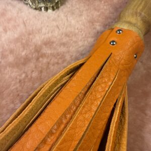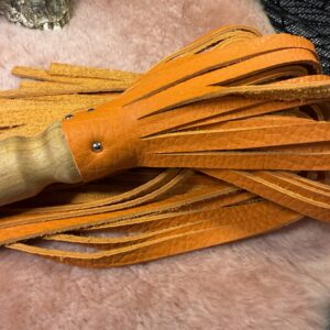 Zestfall, a flogger made from a zesty orange heavy supple leather. This flogger features 42 1cm wide falls that are 42cm long . This flogger will give you a thuddy sensation with a little bite. All seated in a reclaimed handle .
